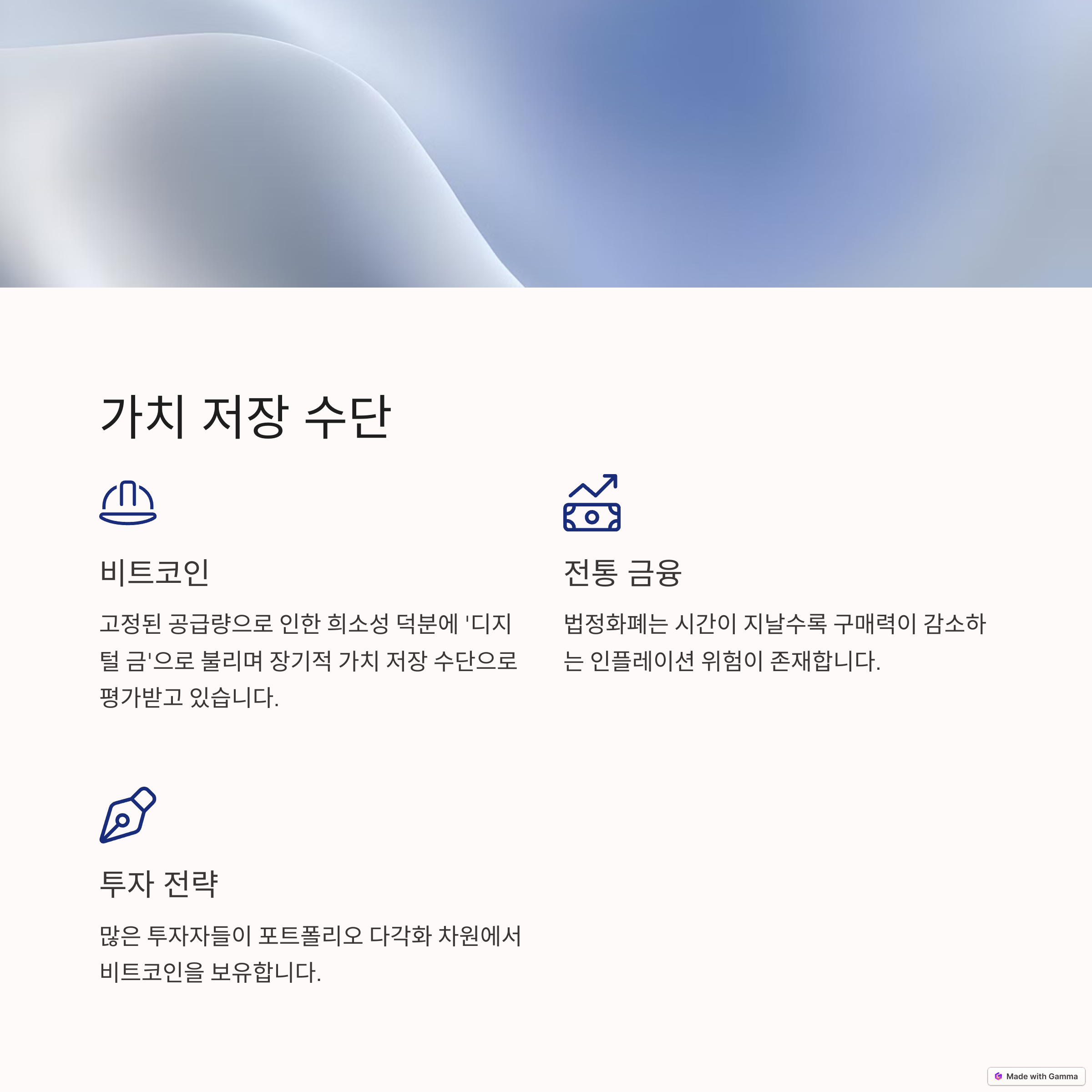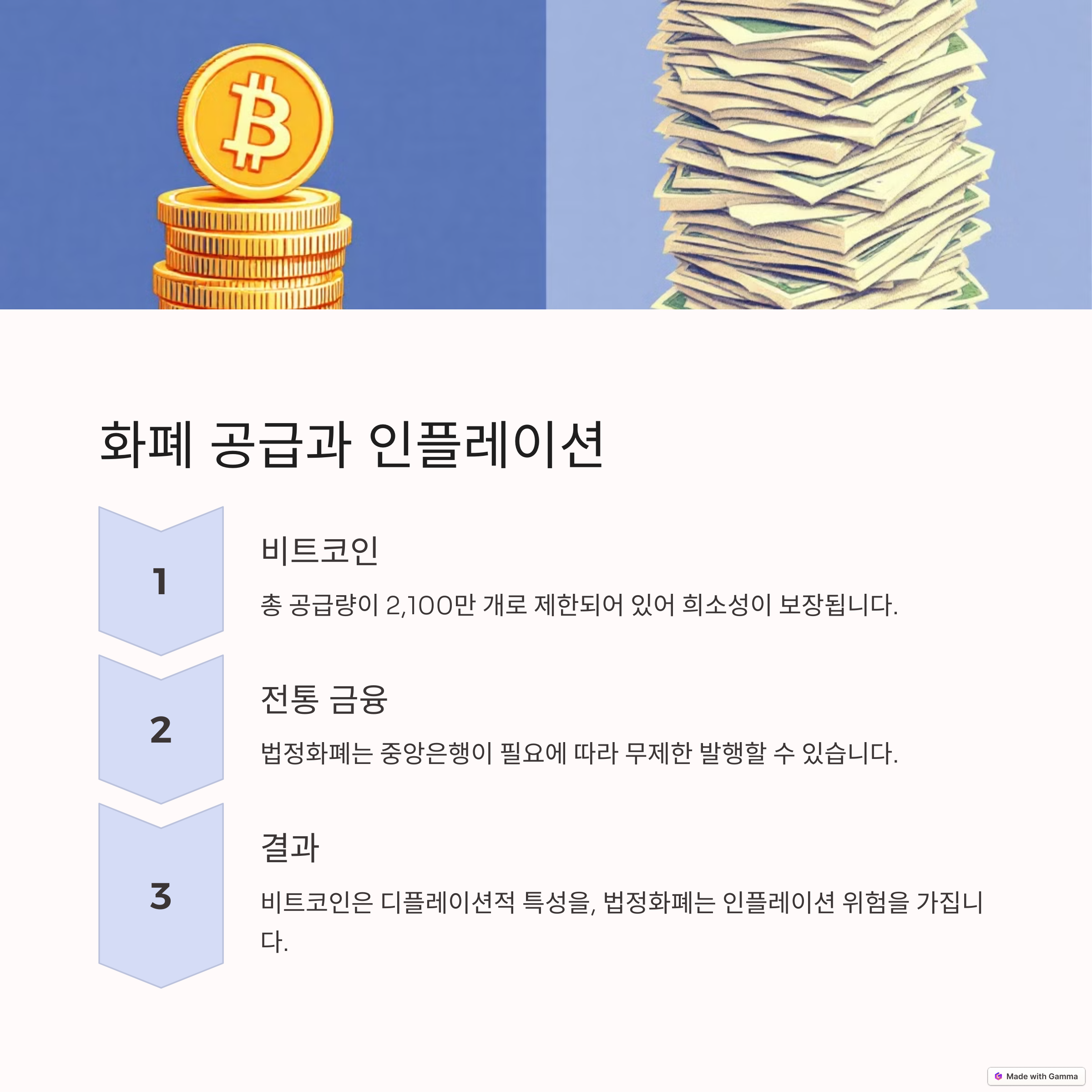 | 공급량 2,100만 개 제한 | 인플레이션 가능성 존재 | 가치 저장 수단 비교 |