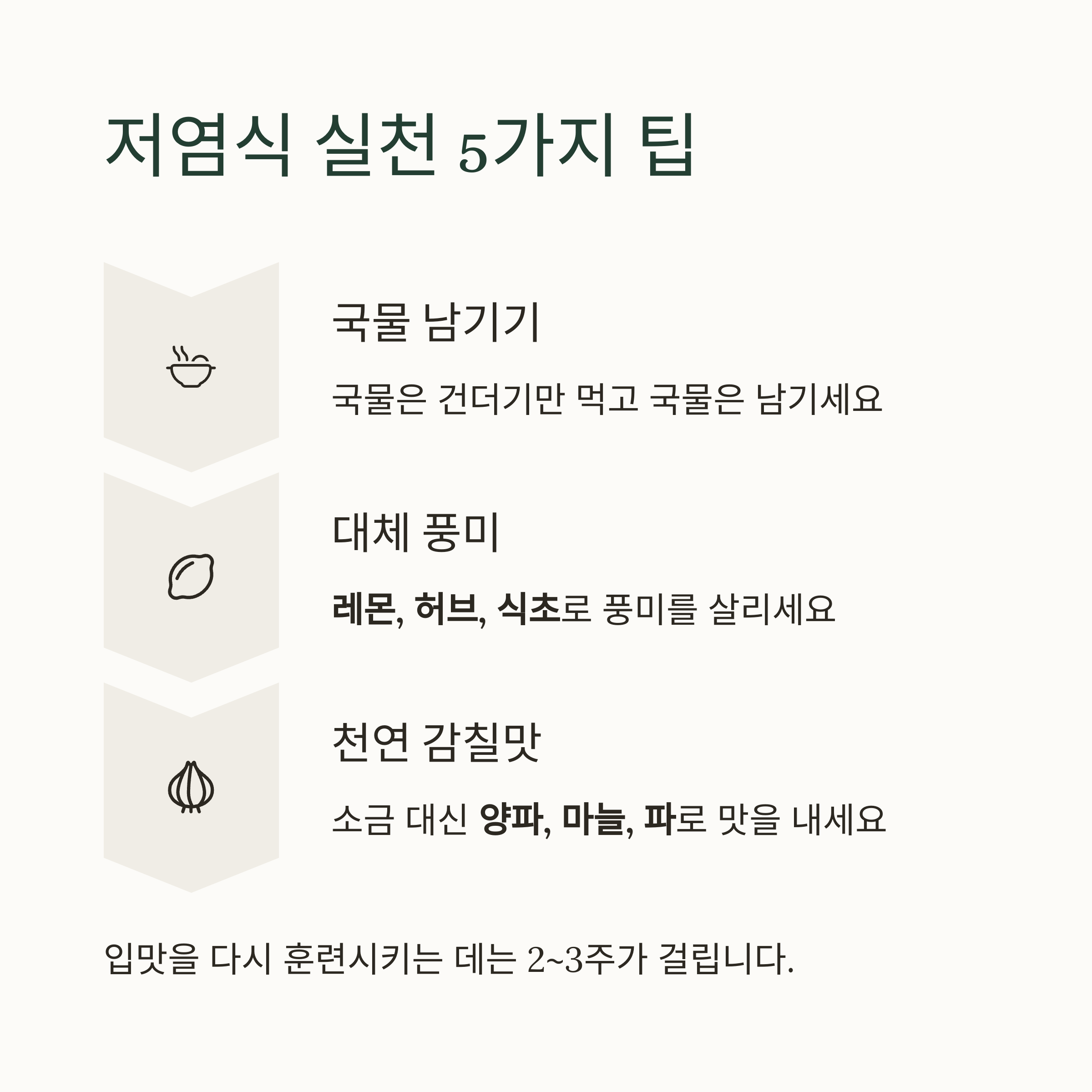 처음엔 싱겁게 느껴져도, 2~4주면 새롭게 적응됩니다.