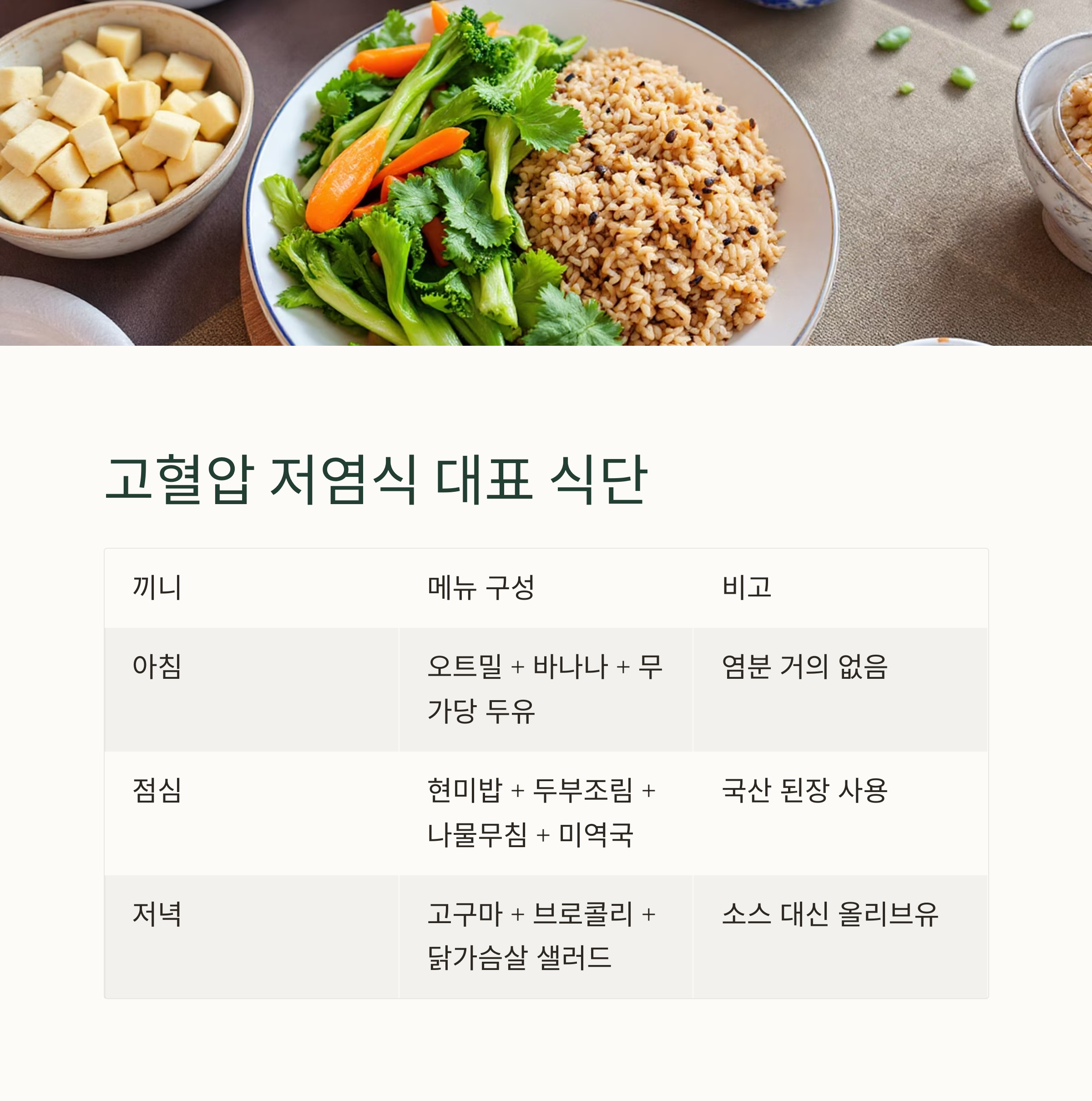 | 아침 | 오트밀 + 바나나 + 무가당 두유 | 염분 거의 없음 |