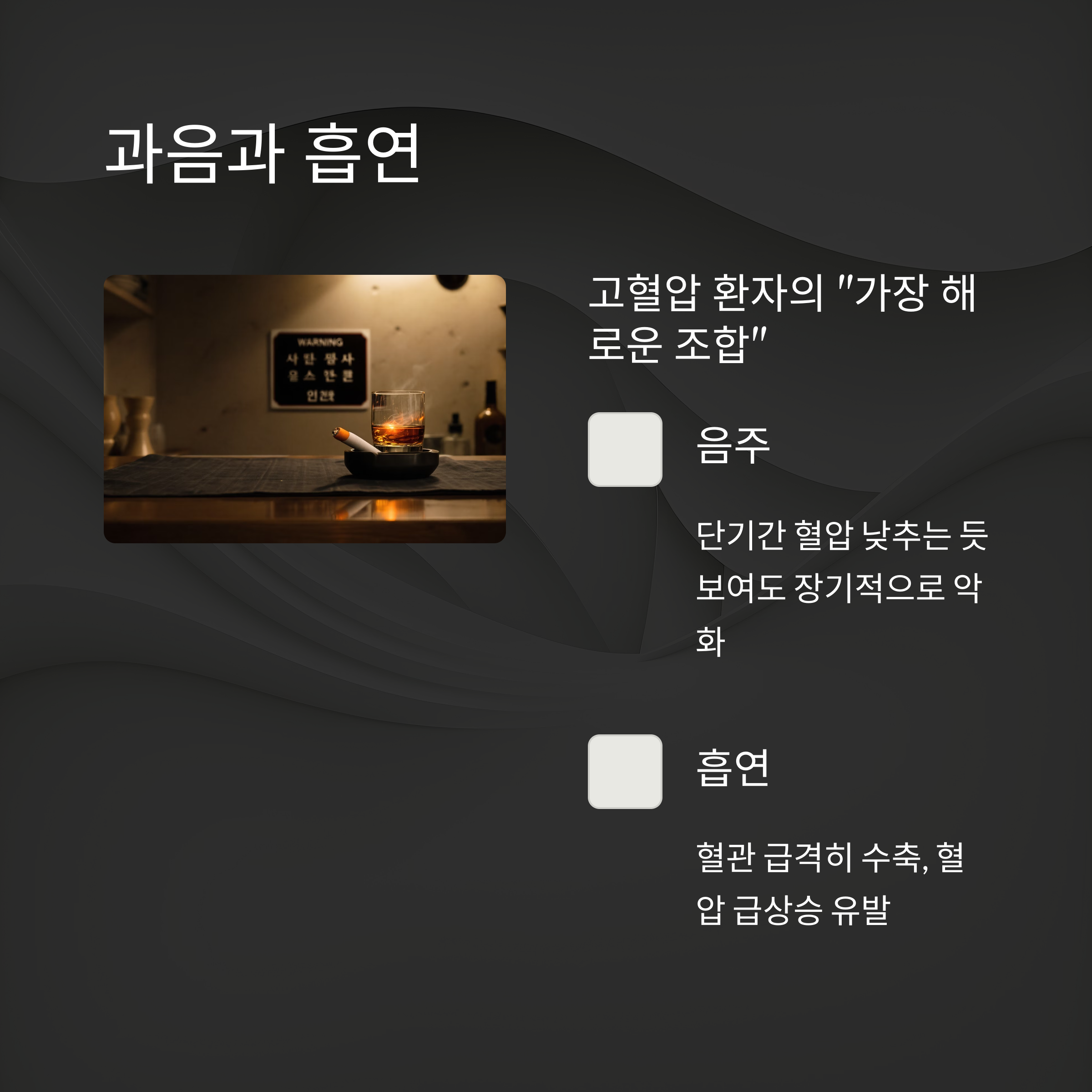 혈압 급상승을 유발합니다 - 특히 음주 후 흡연은 혈압 관리에 치명적