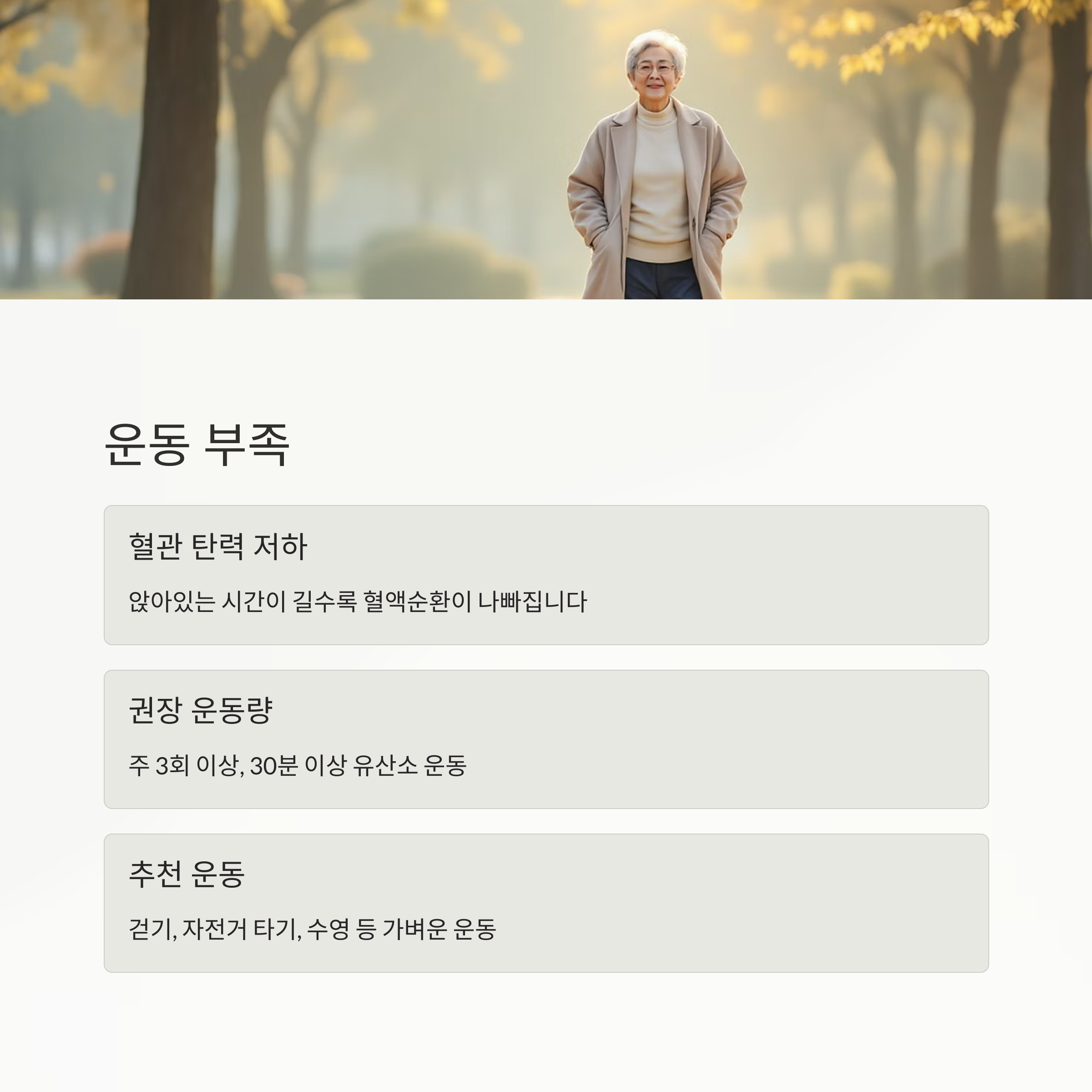 - 운동은 무리 없이, 꾸준히가 핵심입니다