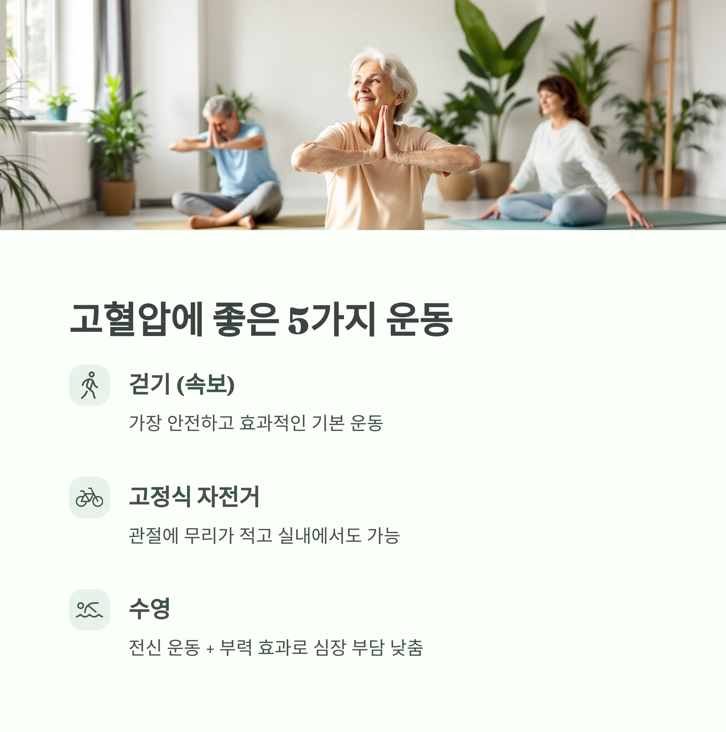 - 요가: 스트레스 완화 → 혈압 안정에 긍정적