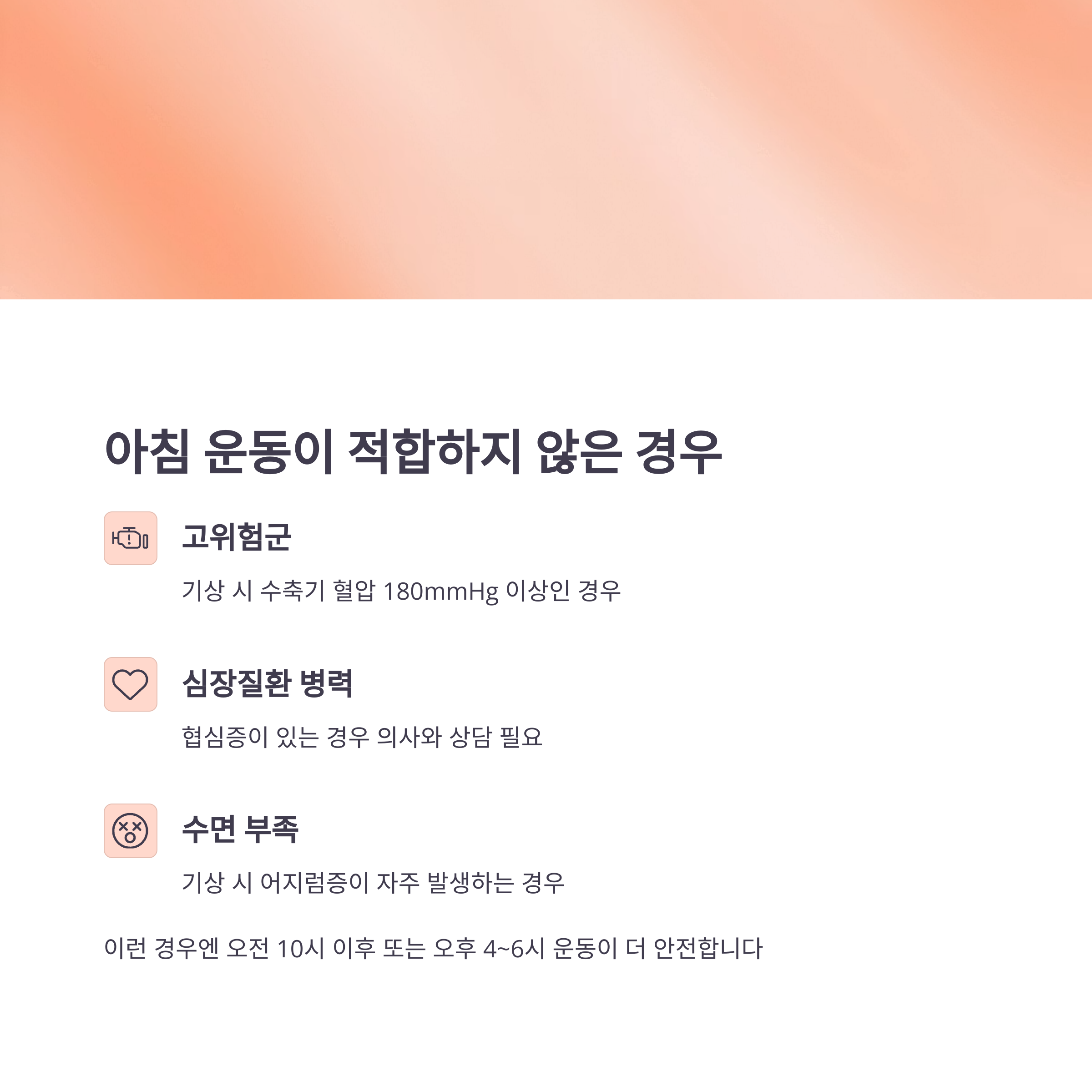 → 의사 상담 후 오후 운동 권장 - 심장질환 병력, 협심증이 있는 경우