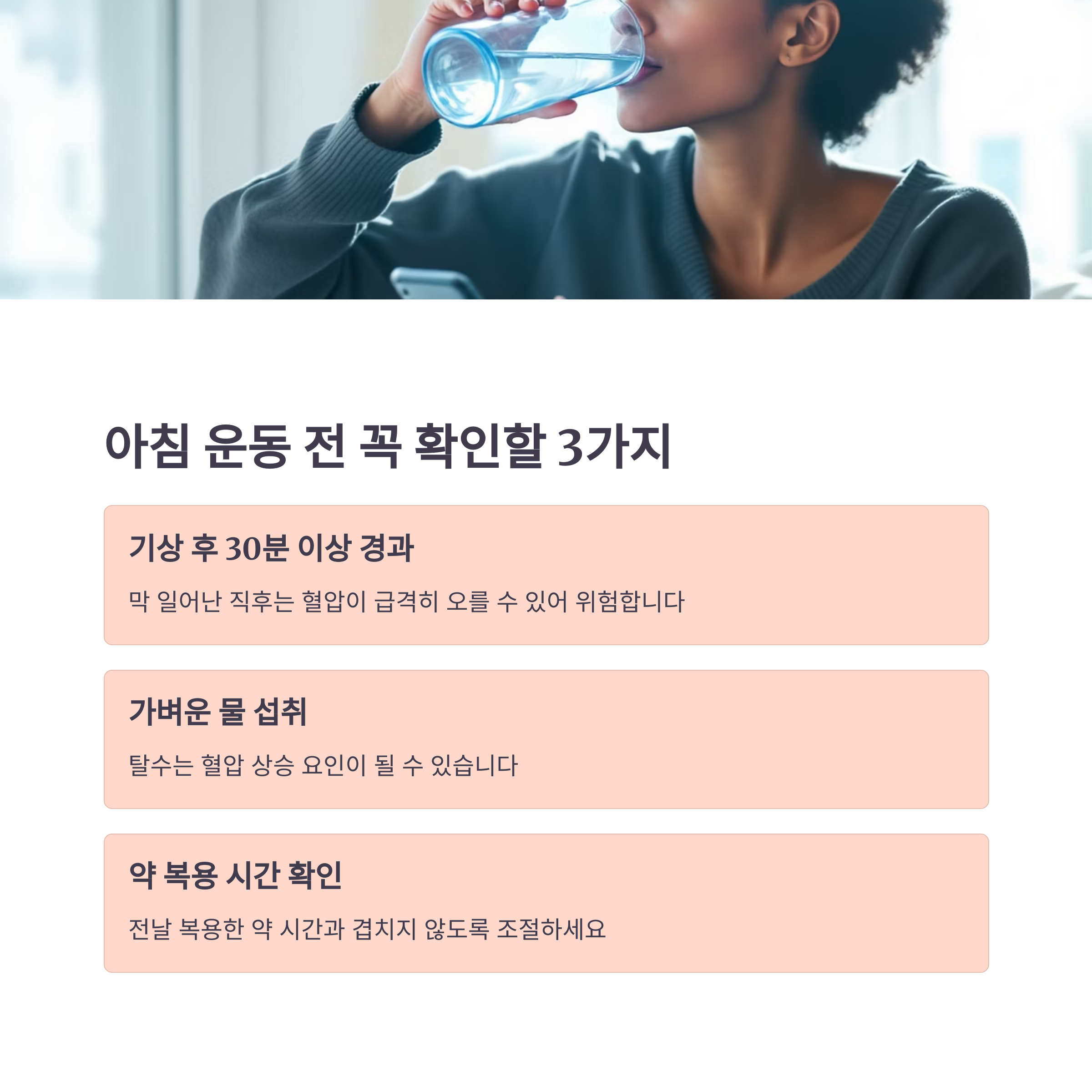 막 일어난 직후는 혈압이 급격히 오를 수 있어 위험 - 가벼운 물 섭취 후 운동: