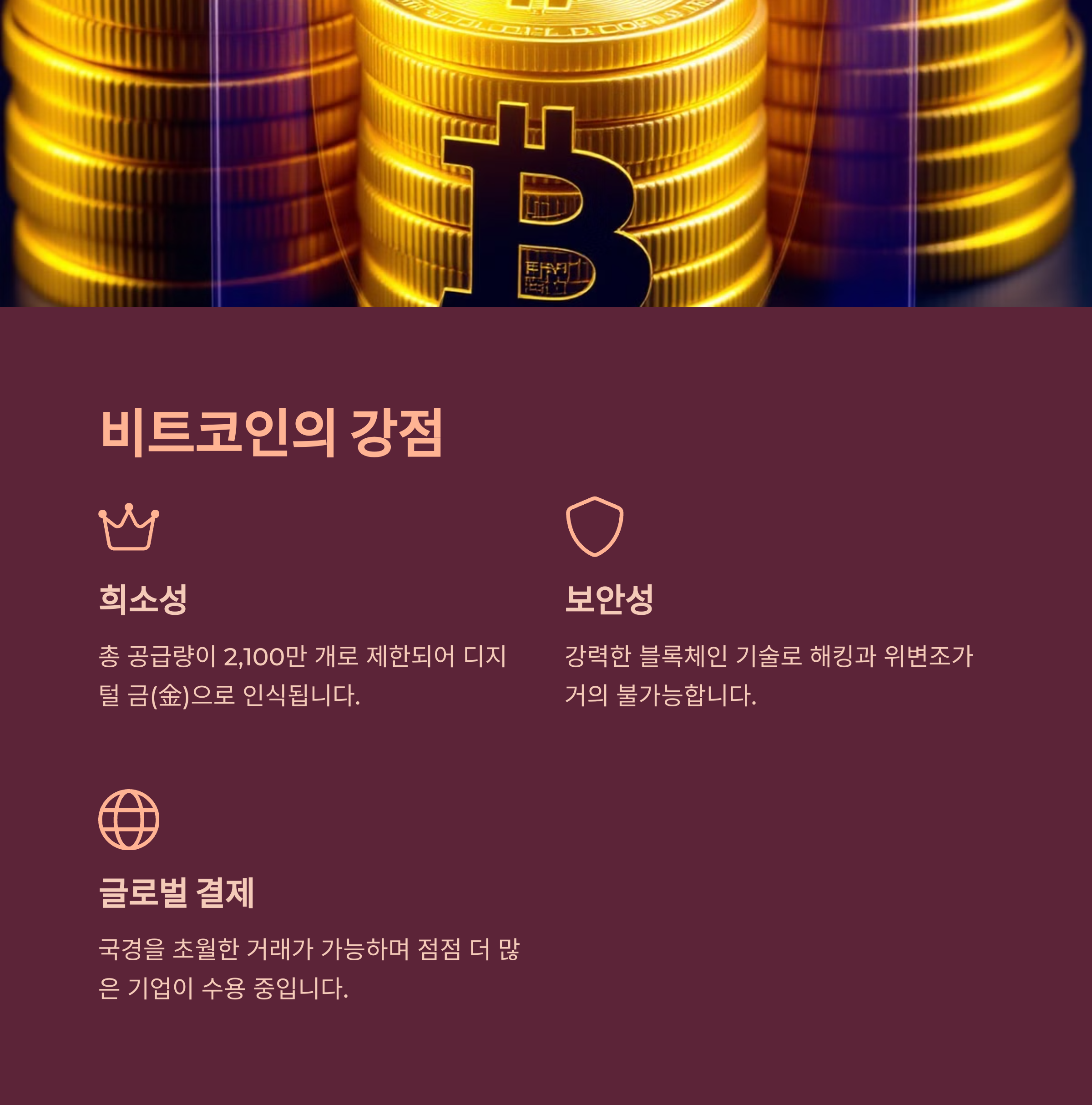 | 비트코인의 특징 | 가치 저장 수단, 공급량 제한, 결제 기능 |