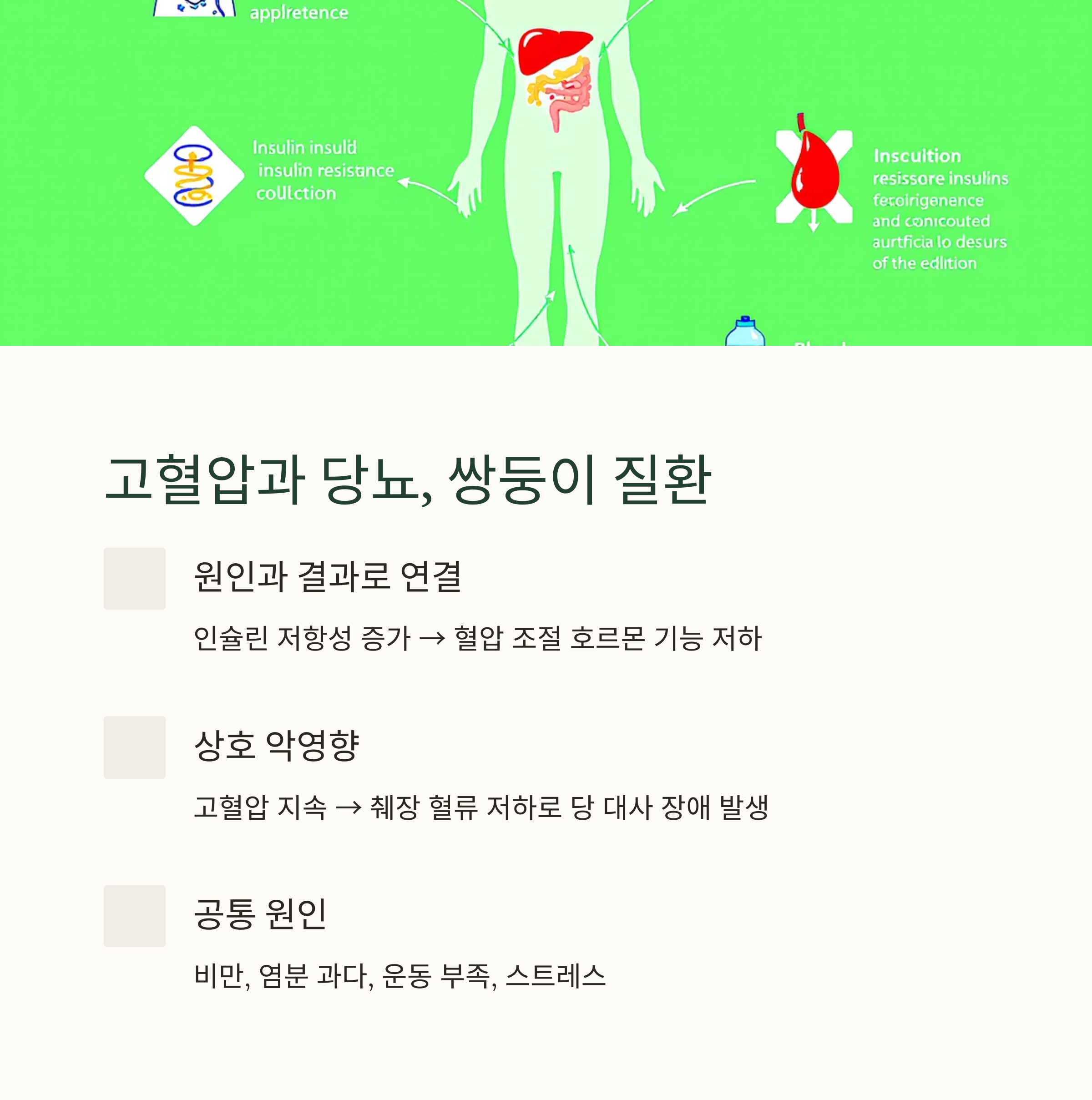 - 공통 원인: 비만, 염분 과다, 운동 부족, 스트레스