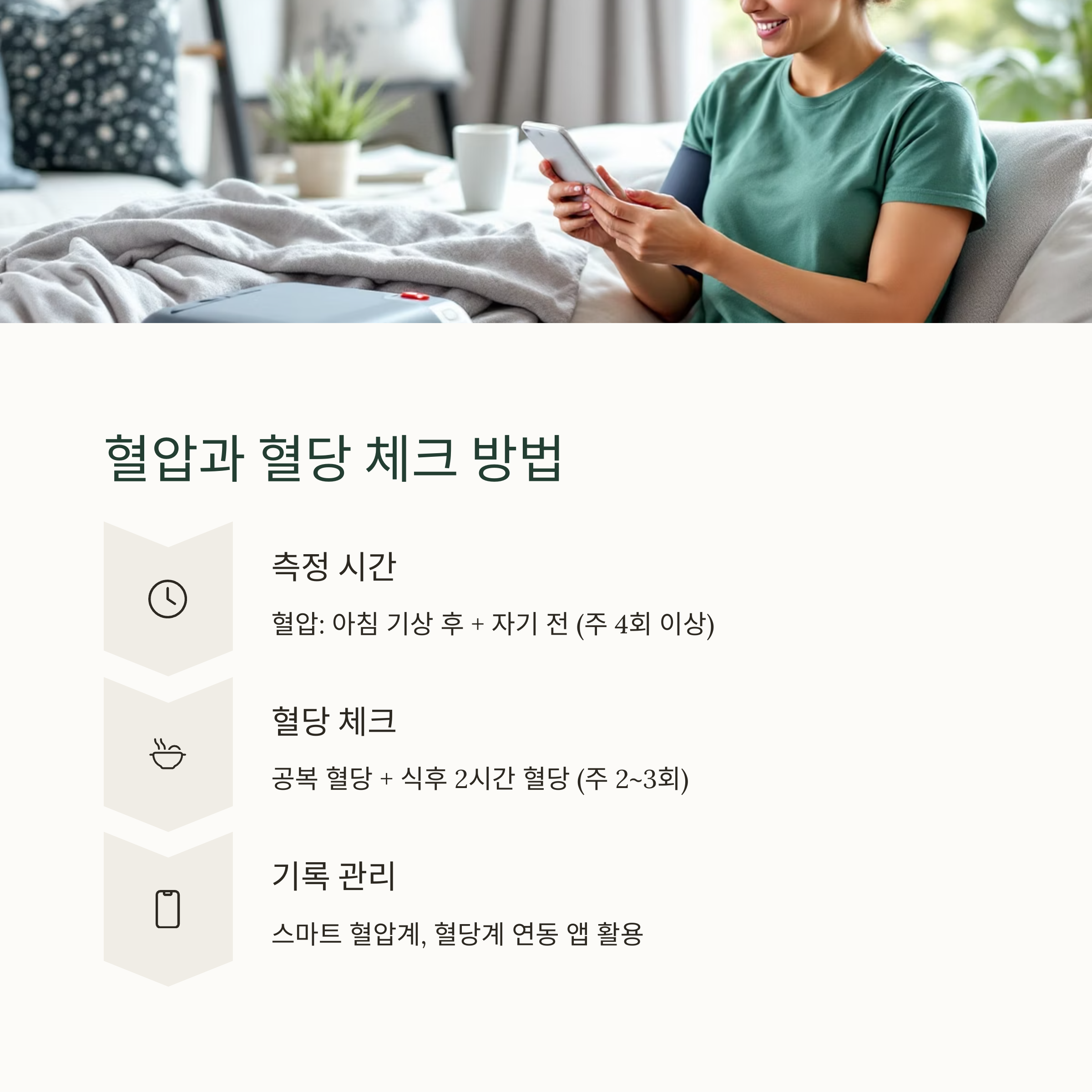 - 혈당: 공복 혈당 + 식후 2시간 혈당 주 2~3회 이상 체크