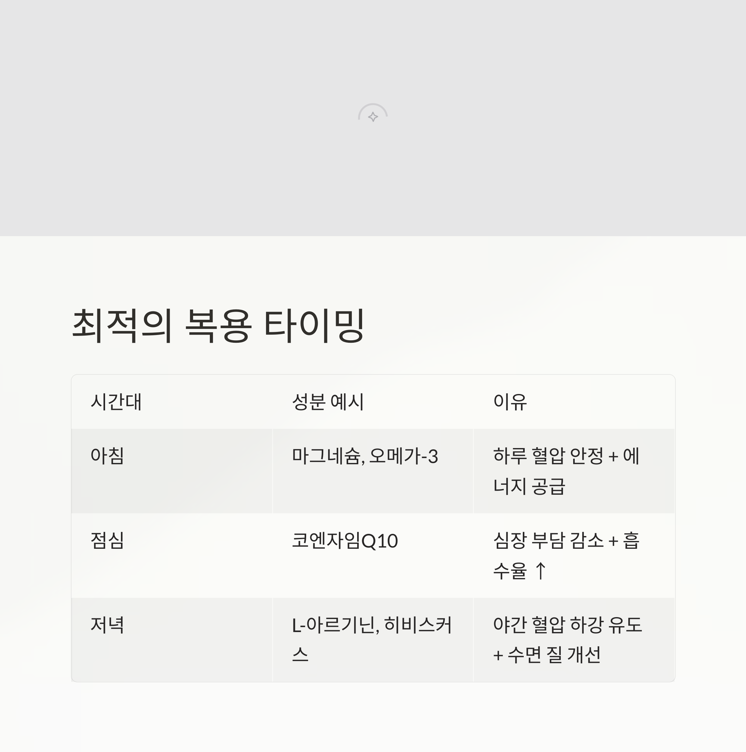 | 저녁 | L-아르기닌, 히비스커스 | 야간 혈압 하강 유도 + 수면 질 개선 |
