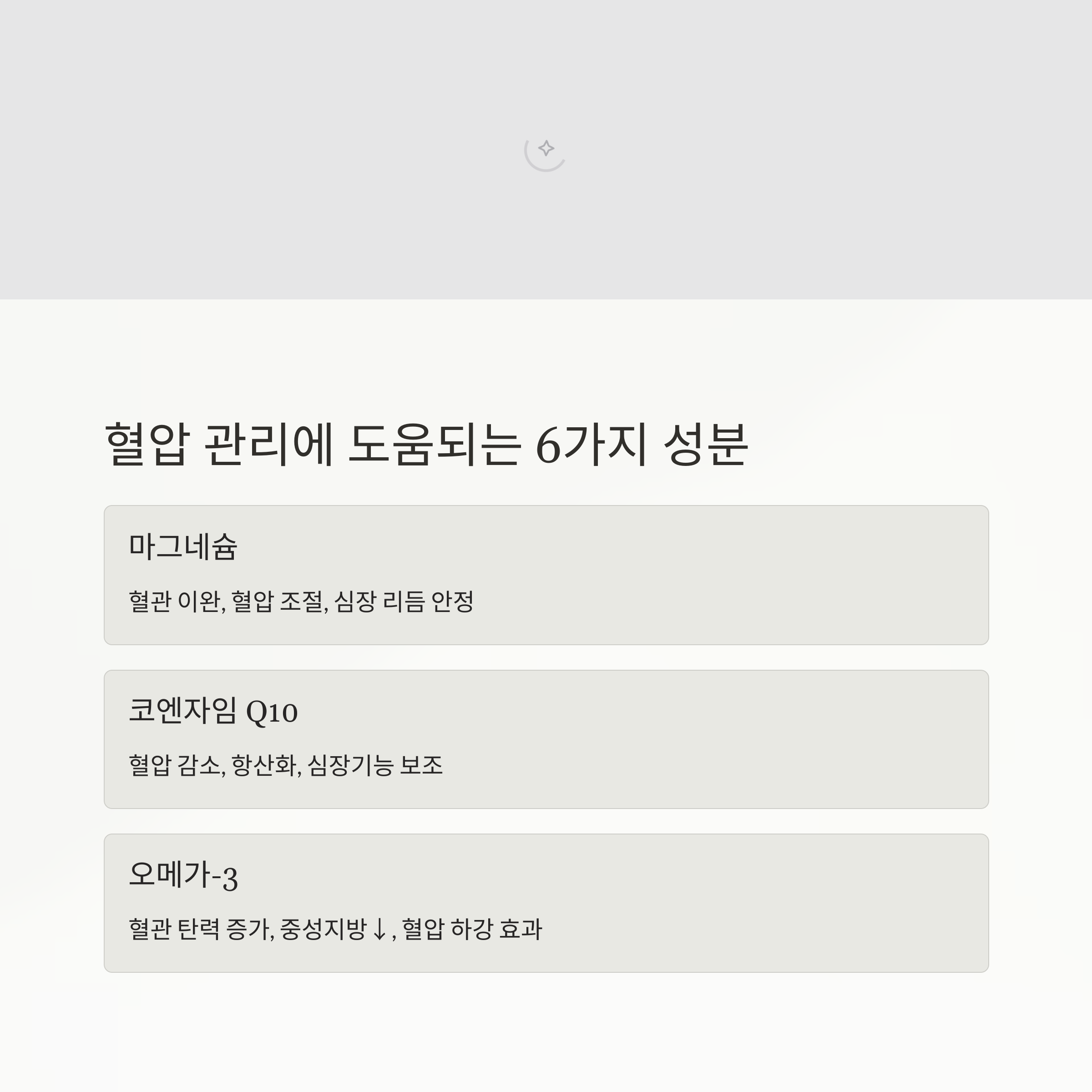| 아침 | 마그네슘, 오메가-3 | 하루 혈압 안정 + 에너지 공급 |