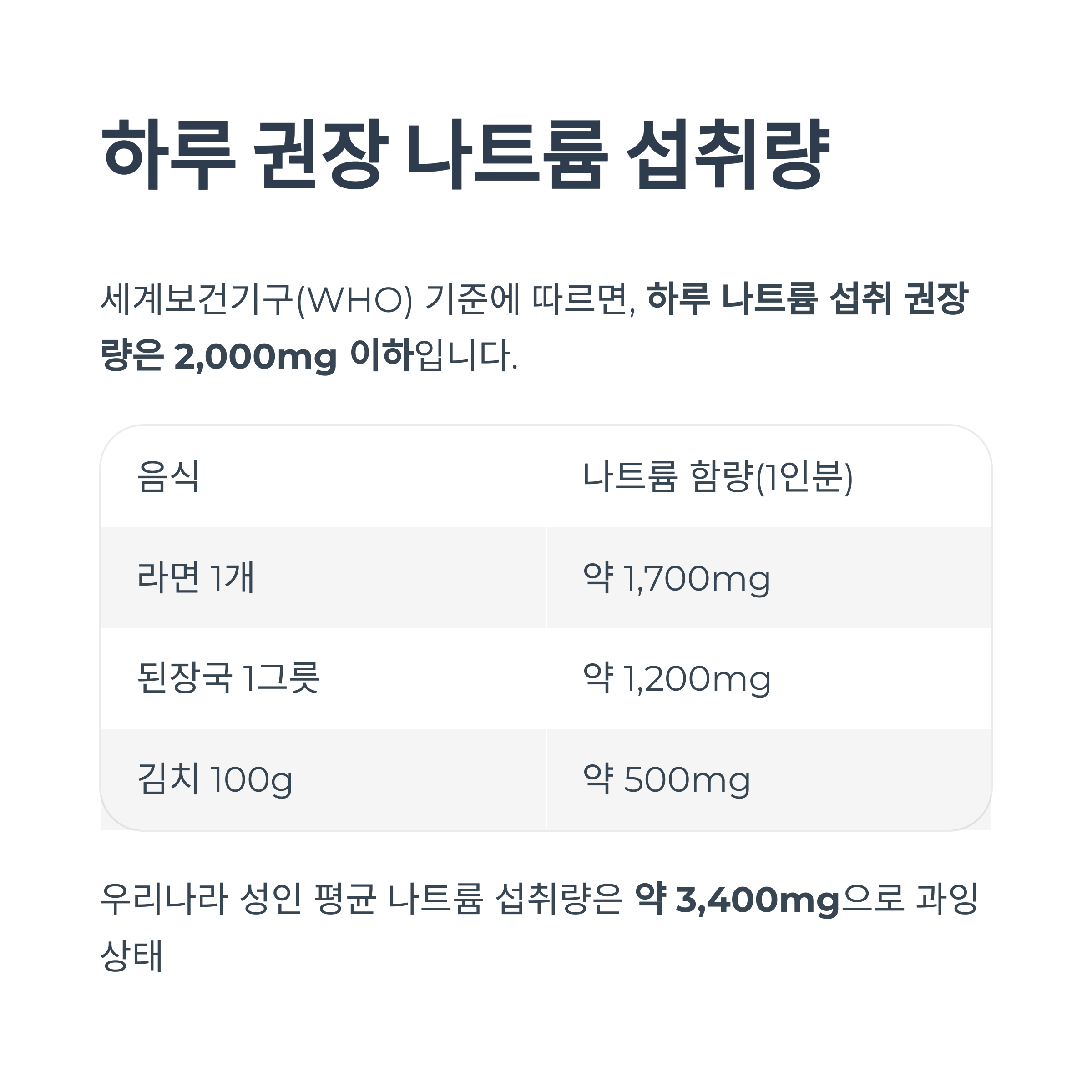 - 우리나라 성인 평균 나트륨 섭취량은 약 3,400mg으로 과잉 상태