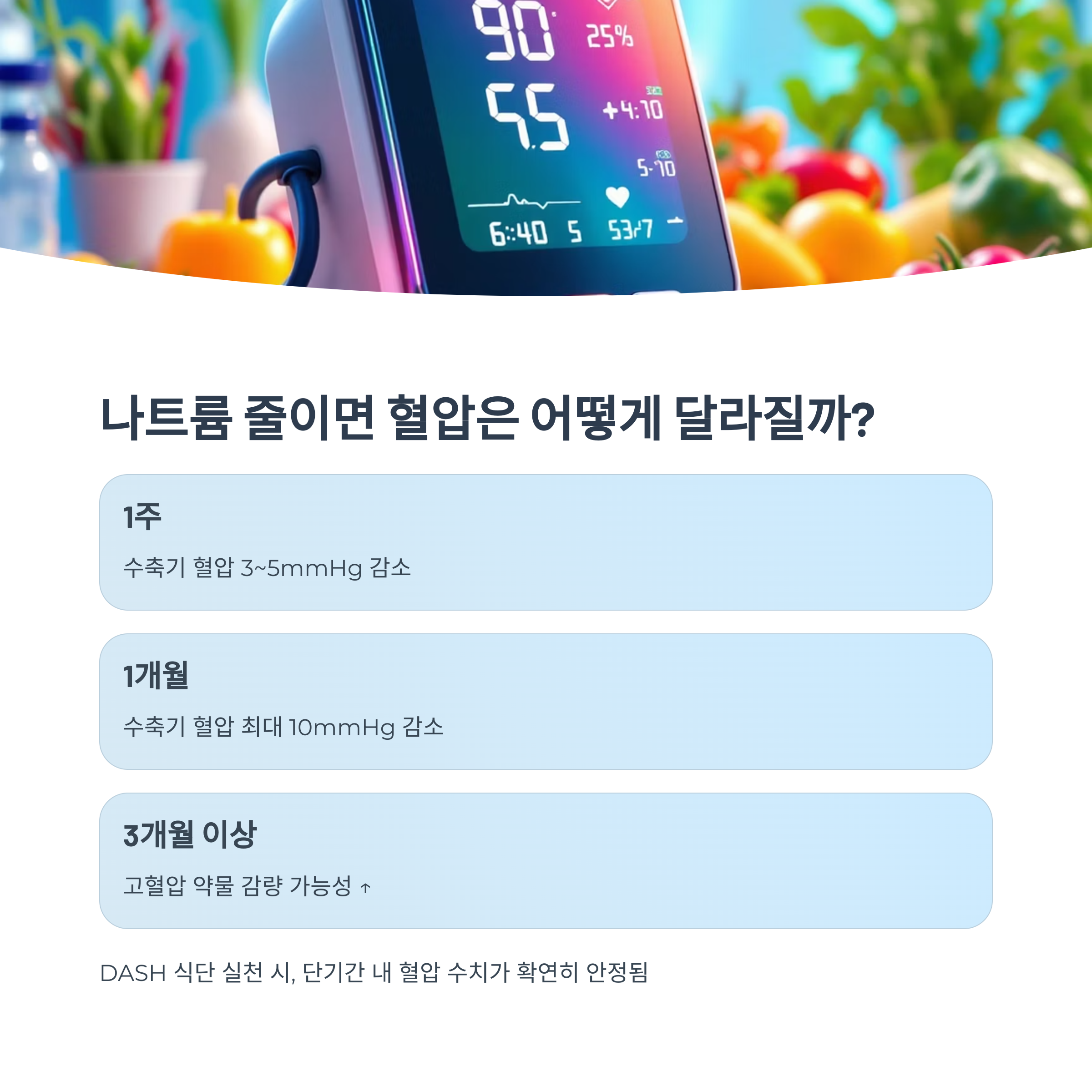 - DASH 식단 실천 시, 단기간 내 혈압 수치가 확연히 안정됨