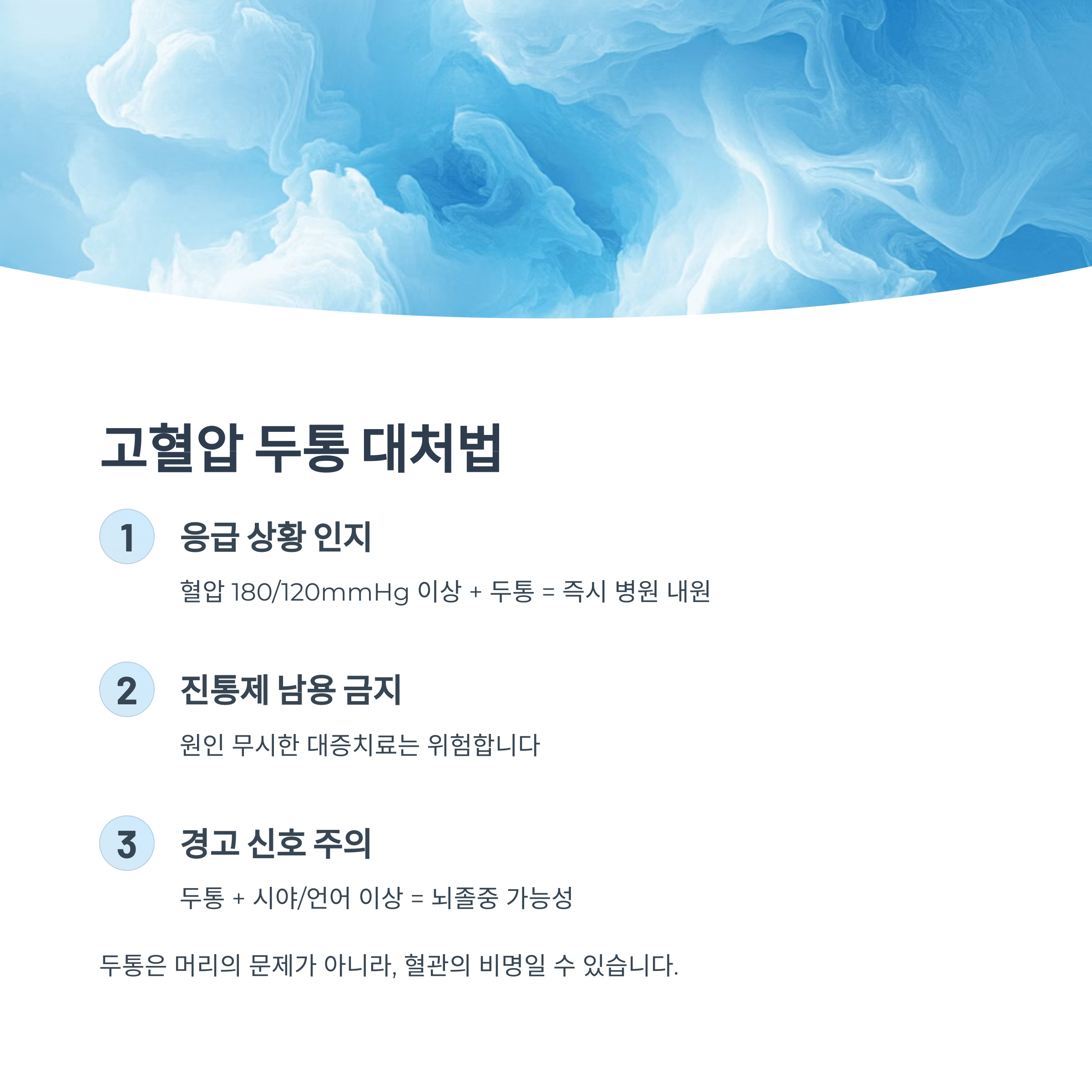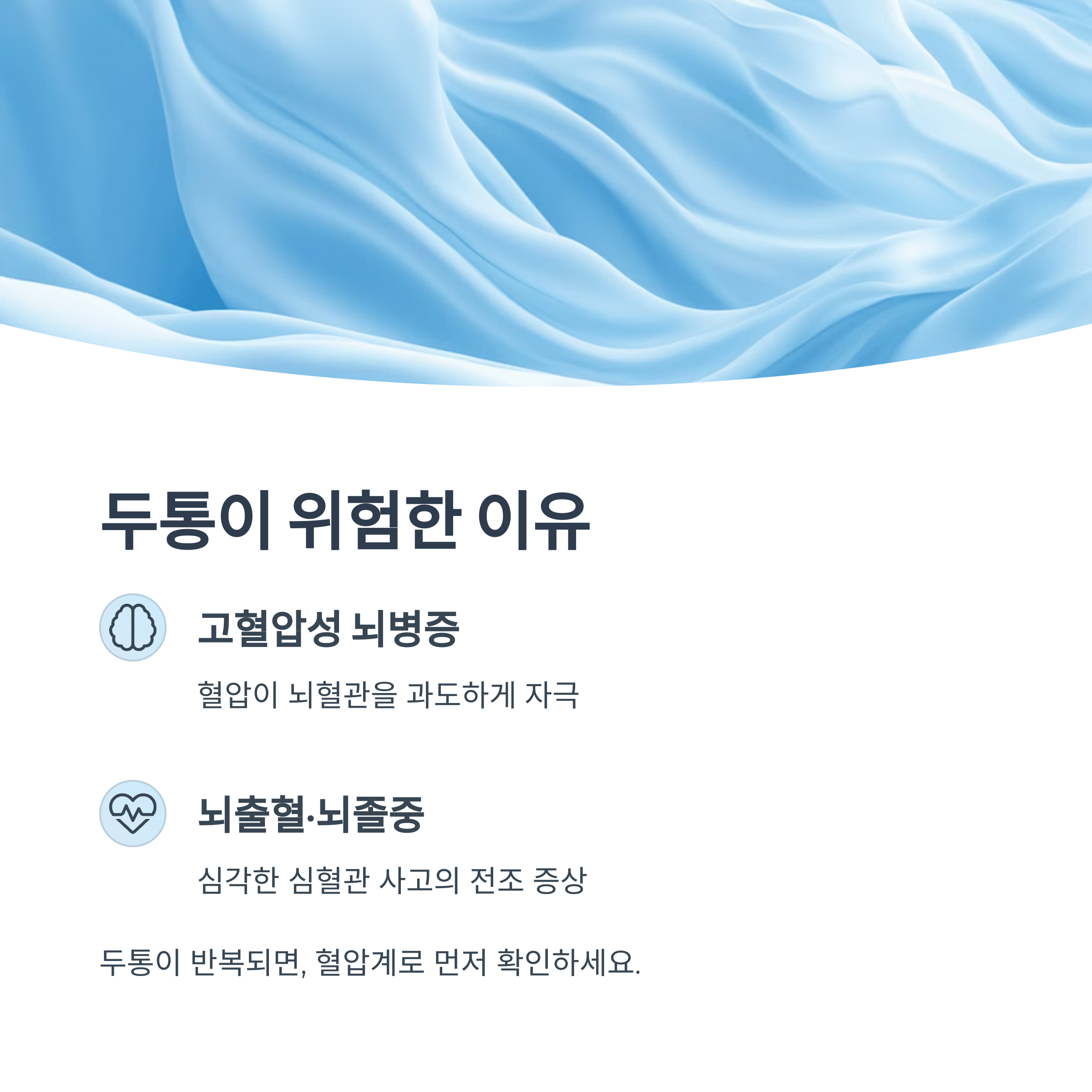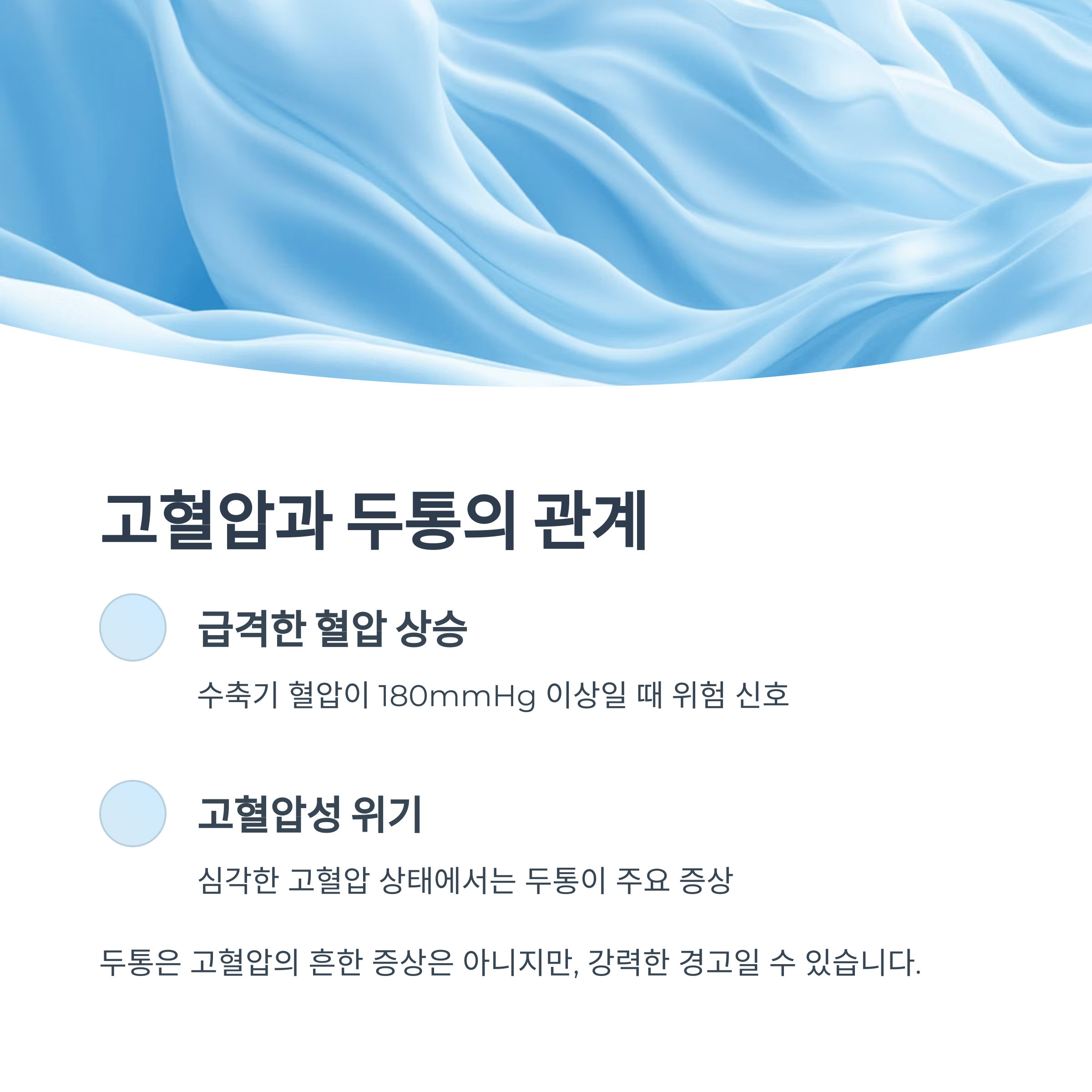 | 동반 증상 | 어지럼증, 코피, 시야 흐림, 흉부 압박 등 동반 가능 |