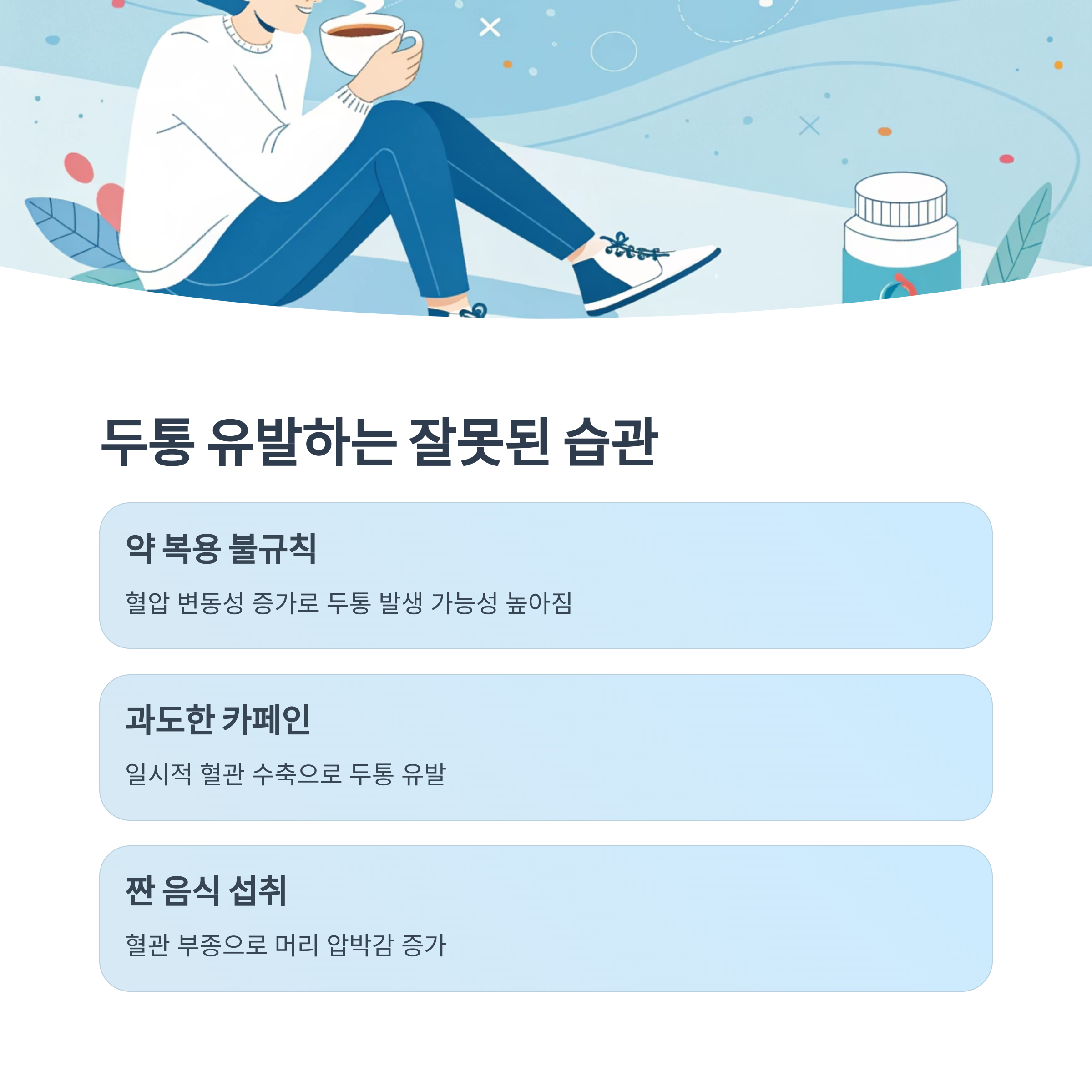| 과도한 카페인 | 일시적 혈관 수축 → 두통 유발 |