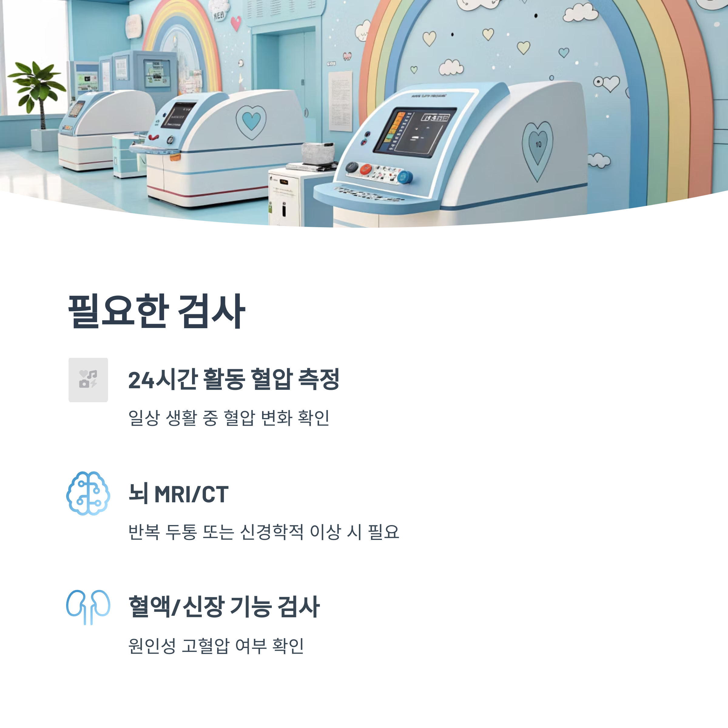 - 혈액검사 + 신장 기능 검사 → 원인성 고혈압 여부 확인
