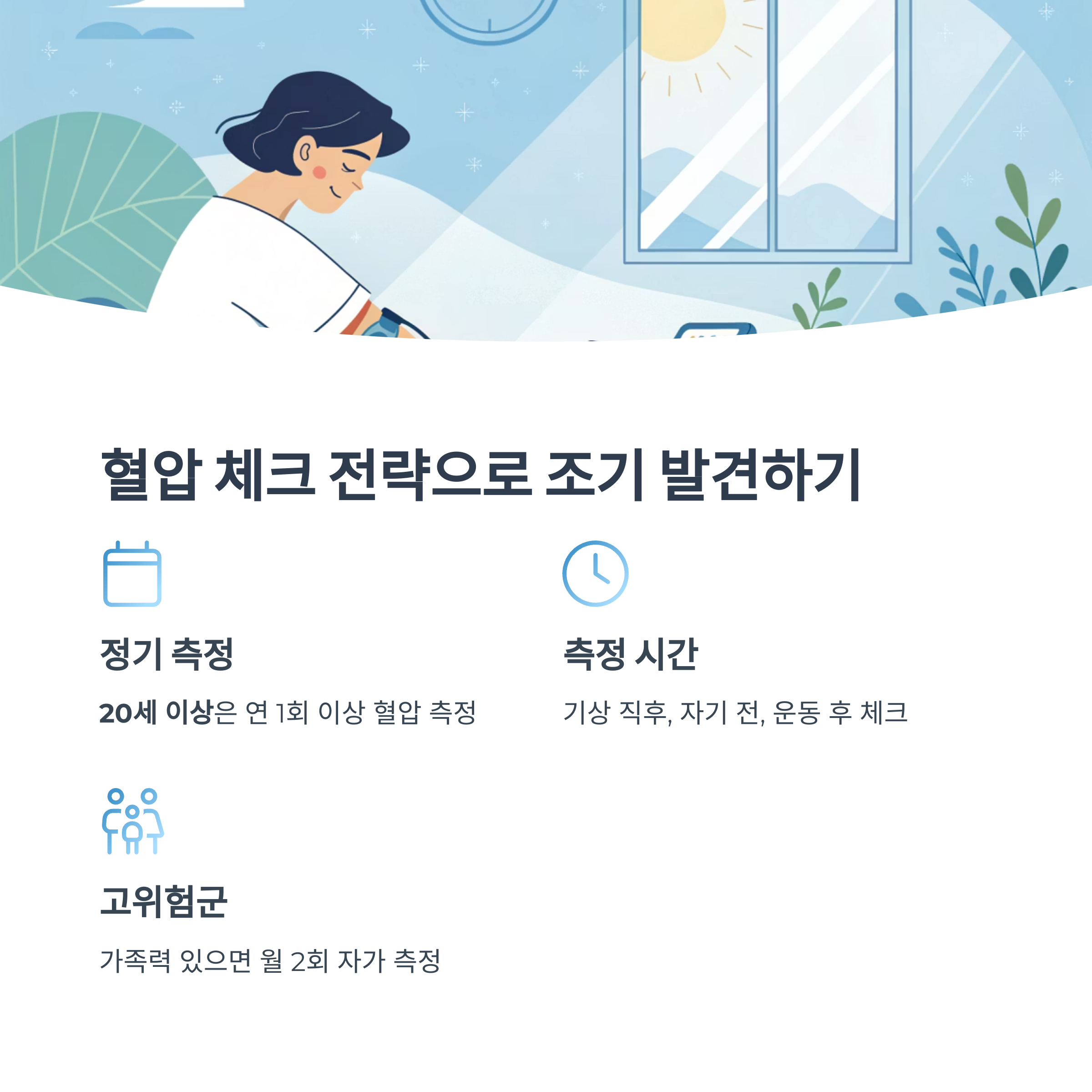 - 고혈압 가족력 or 스트레스 많은 직업군 → 월 2회 자가 측정 권장