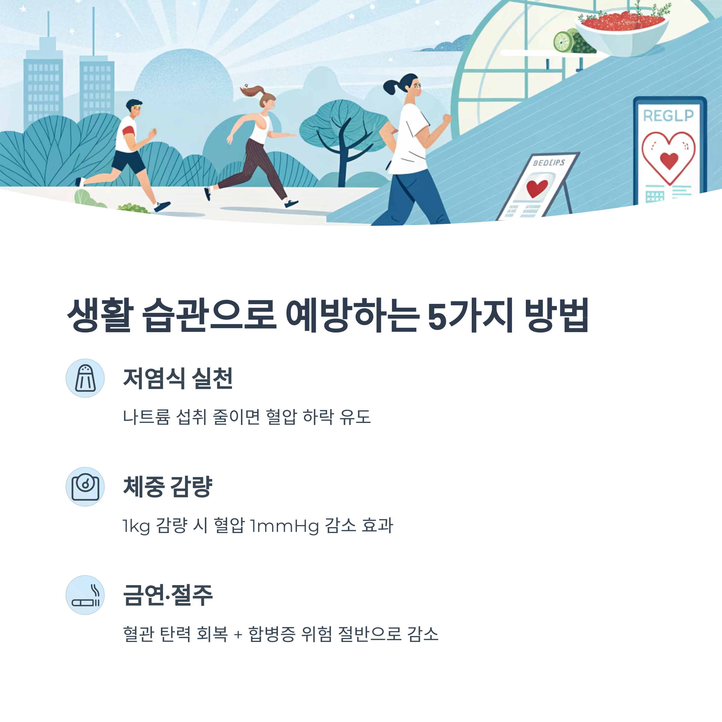 | 꾸준한 유산소 운동 | 혈압 안정 + 심혈관 강화 |