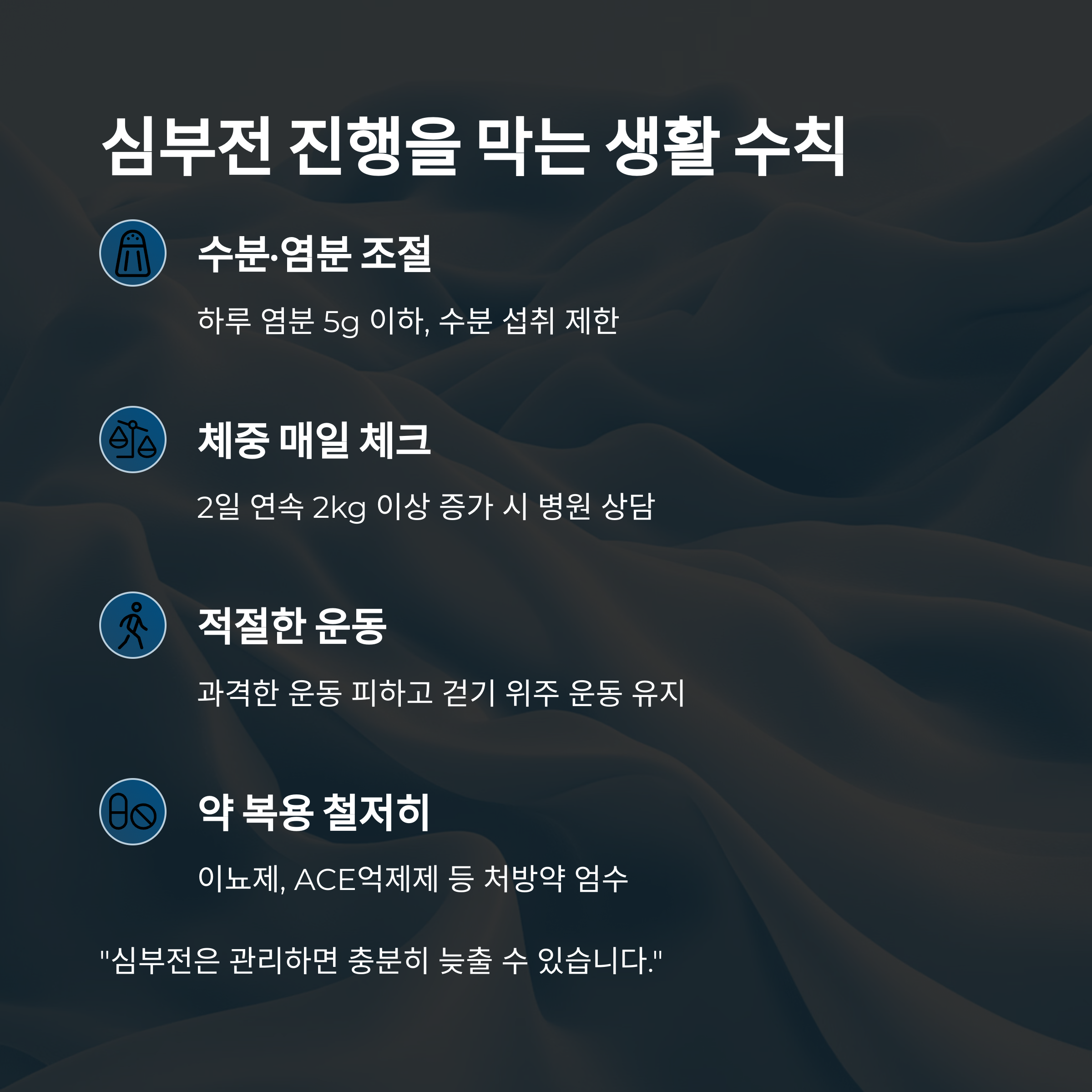 - 약 복용 철저히: 이뇨제, ACE억제제 등 처방약 엄수