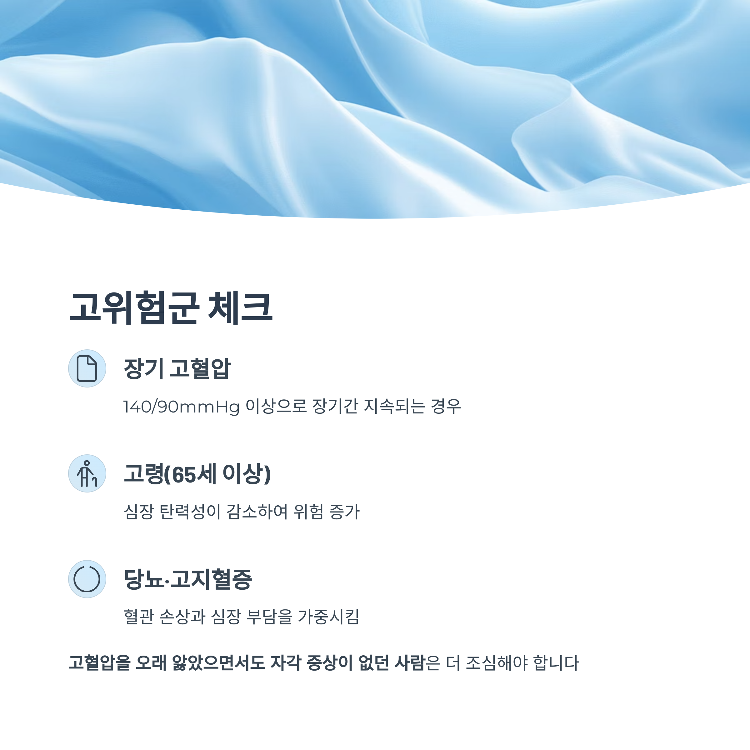- 특히 고혈압을 오래 앓았으면서도 자각 증상이 없던 사람은 더 조심해야 합니다
