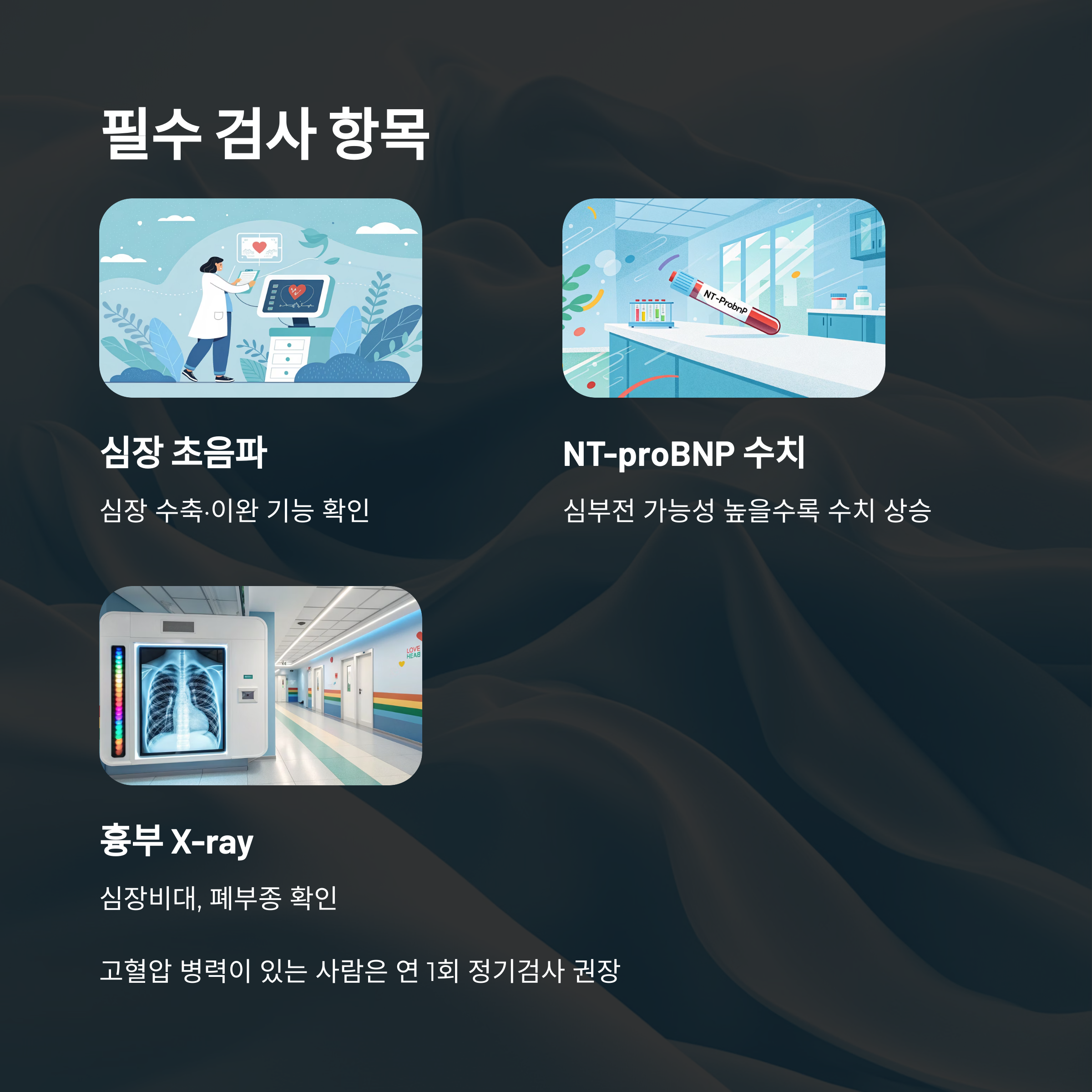| 심장 초음파 (Echocardiogram) | 심장 수축·이완 기능 확인 |