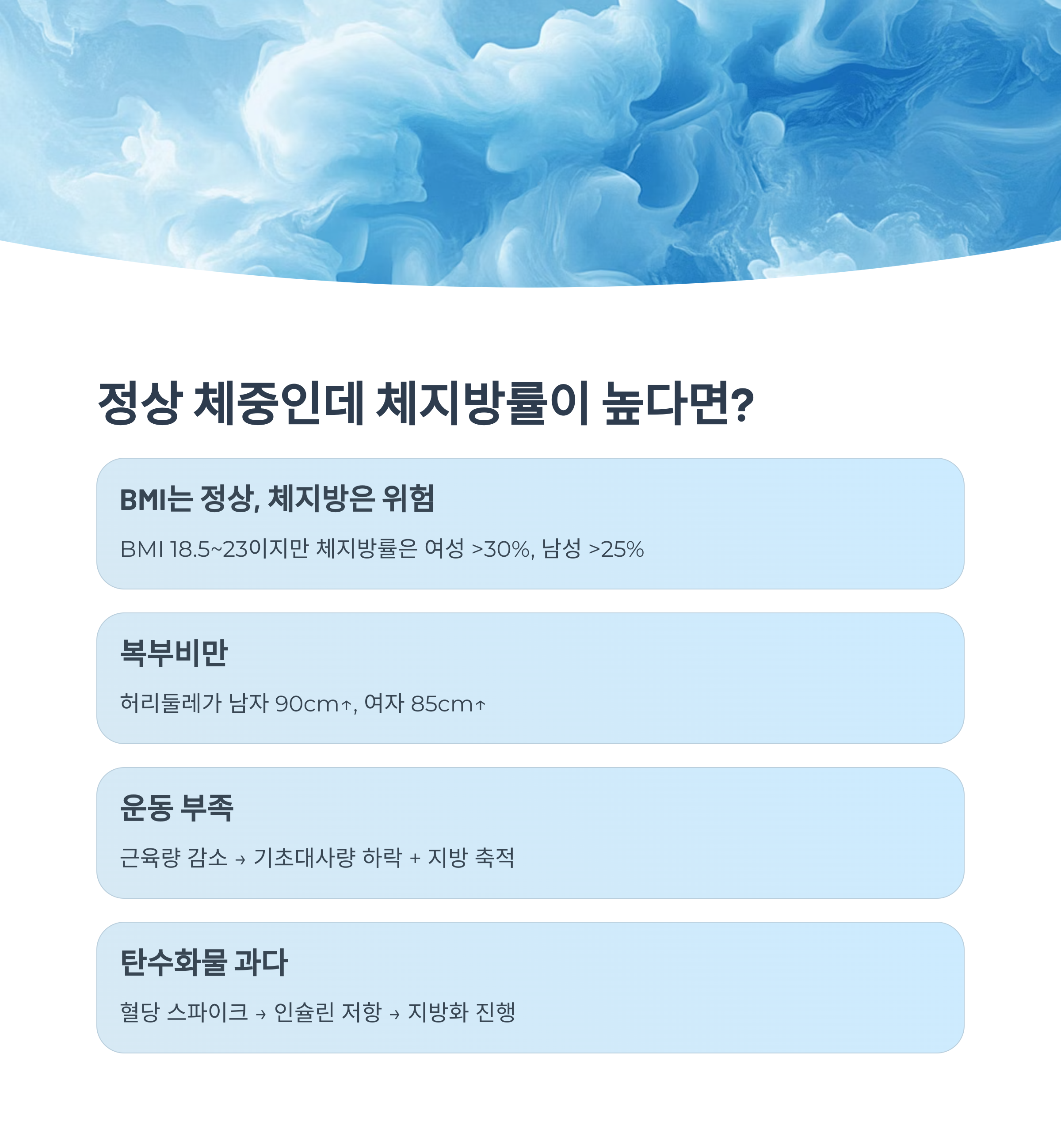 | BMI는 정상 (18.5~23) | 하지만 체지방률은 여성 >30%, 남성 >25% |