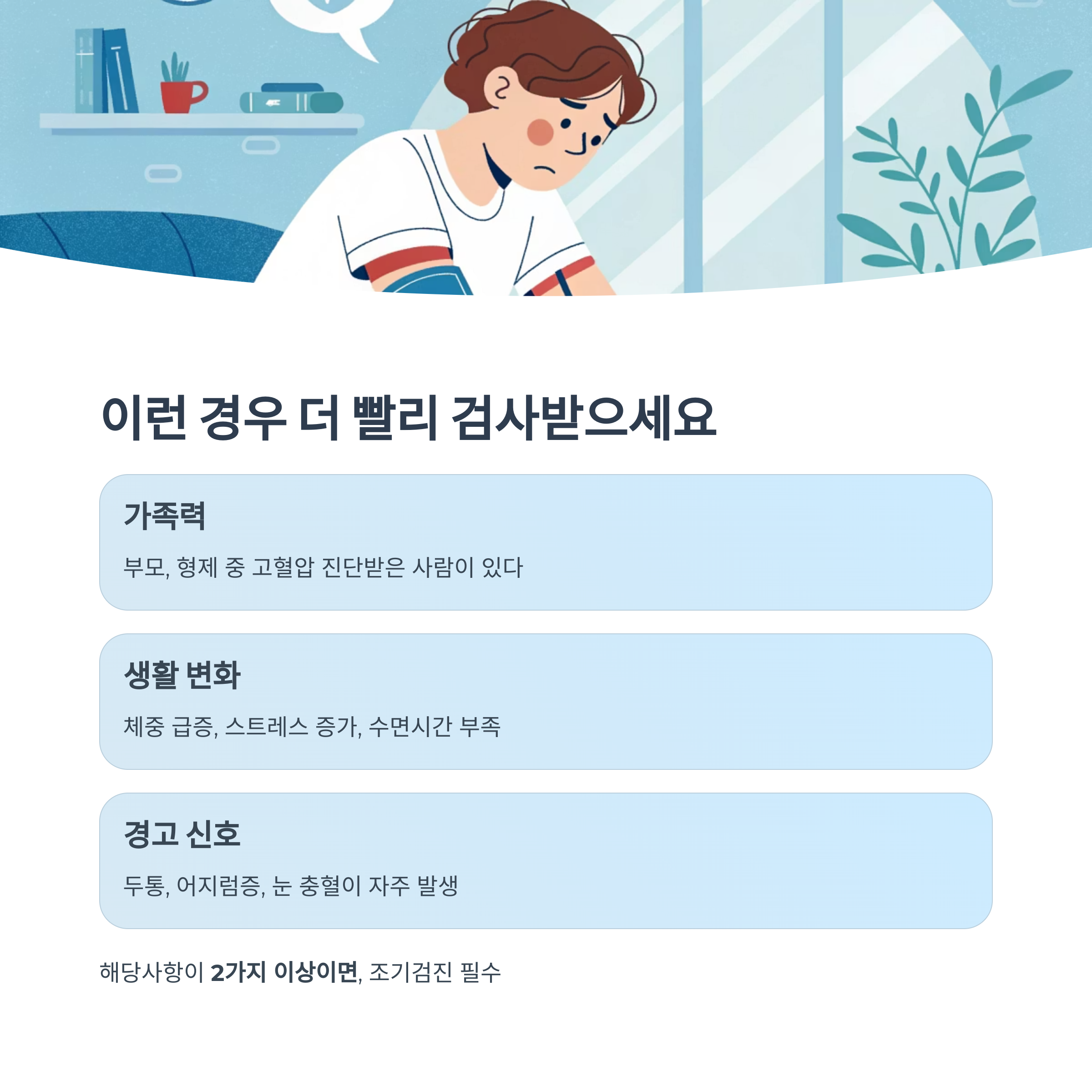 - 고혈압 가족력 있는 경우, 30대부터 매년 정밀검진 권장