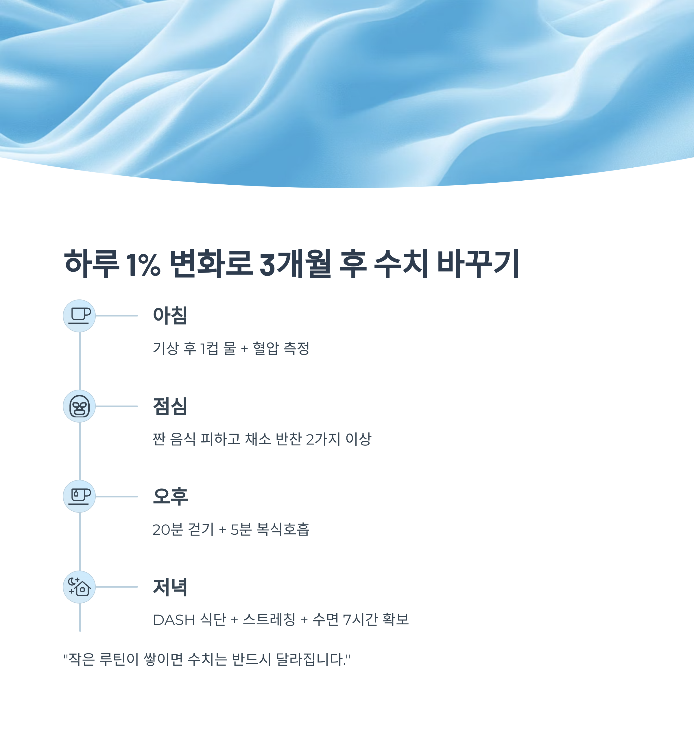 | 저녁 | DASH 식단 + 스트레칭 + 수면 7시간 확보 |