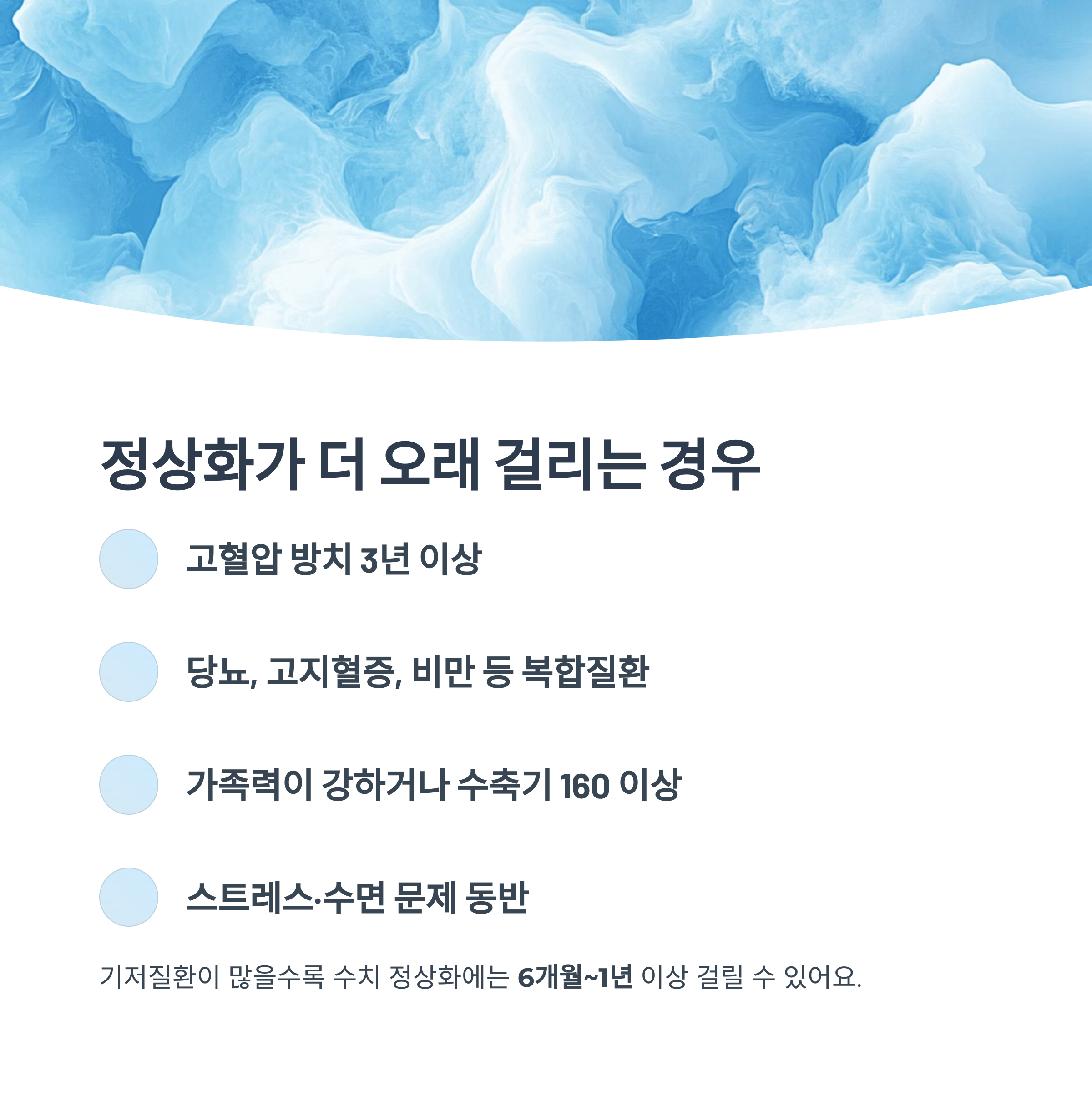 - 고혈압 정상화 후에도 재발 방지를 위한 정기 검진은 필수입니다