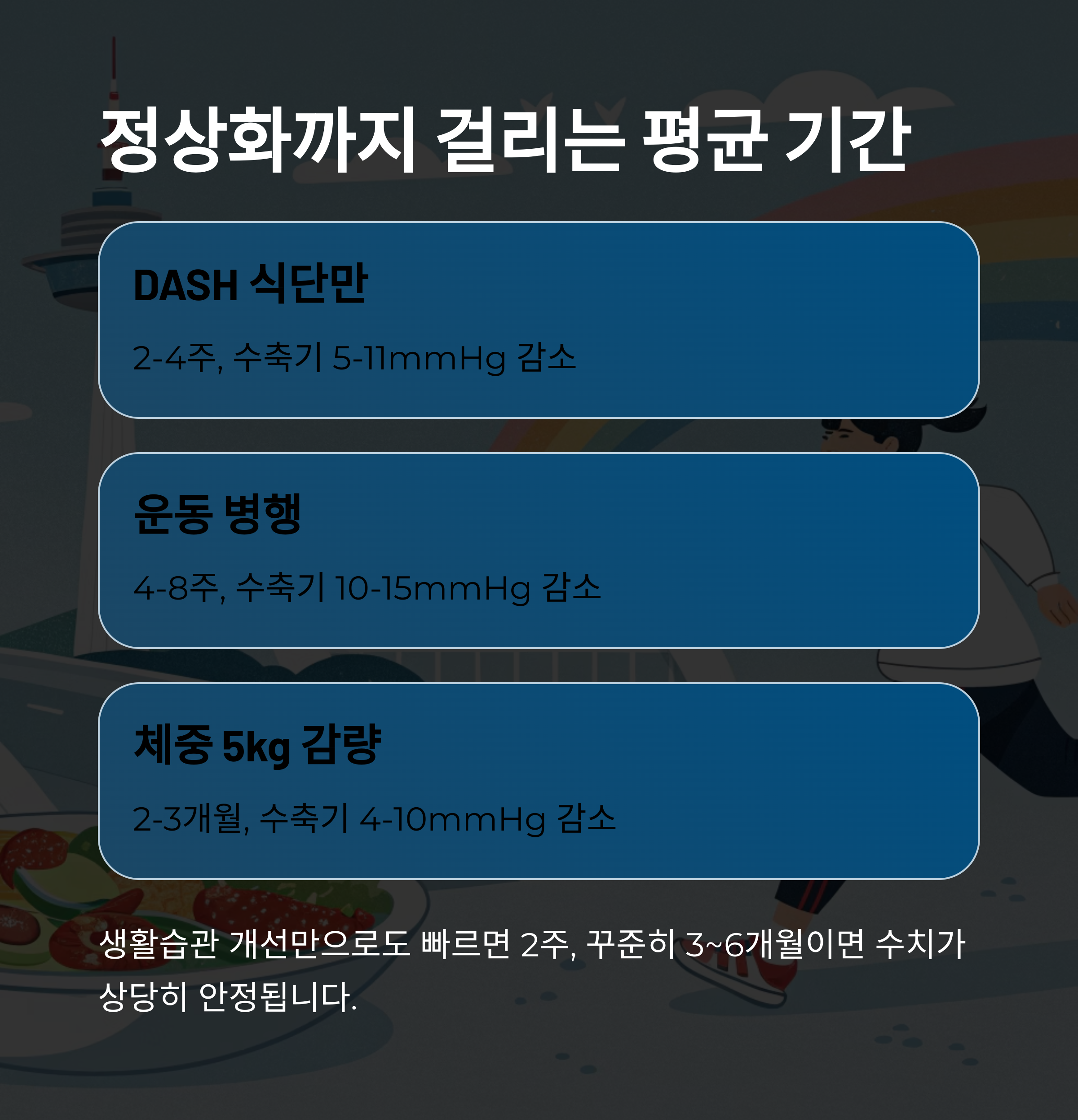 | 운동 병행 시 | 4~8주 | -10~15mmHg |