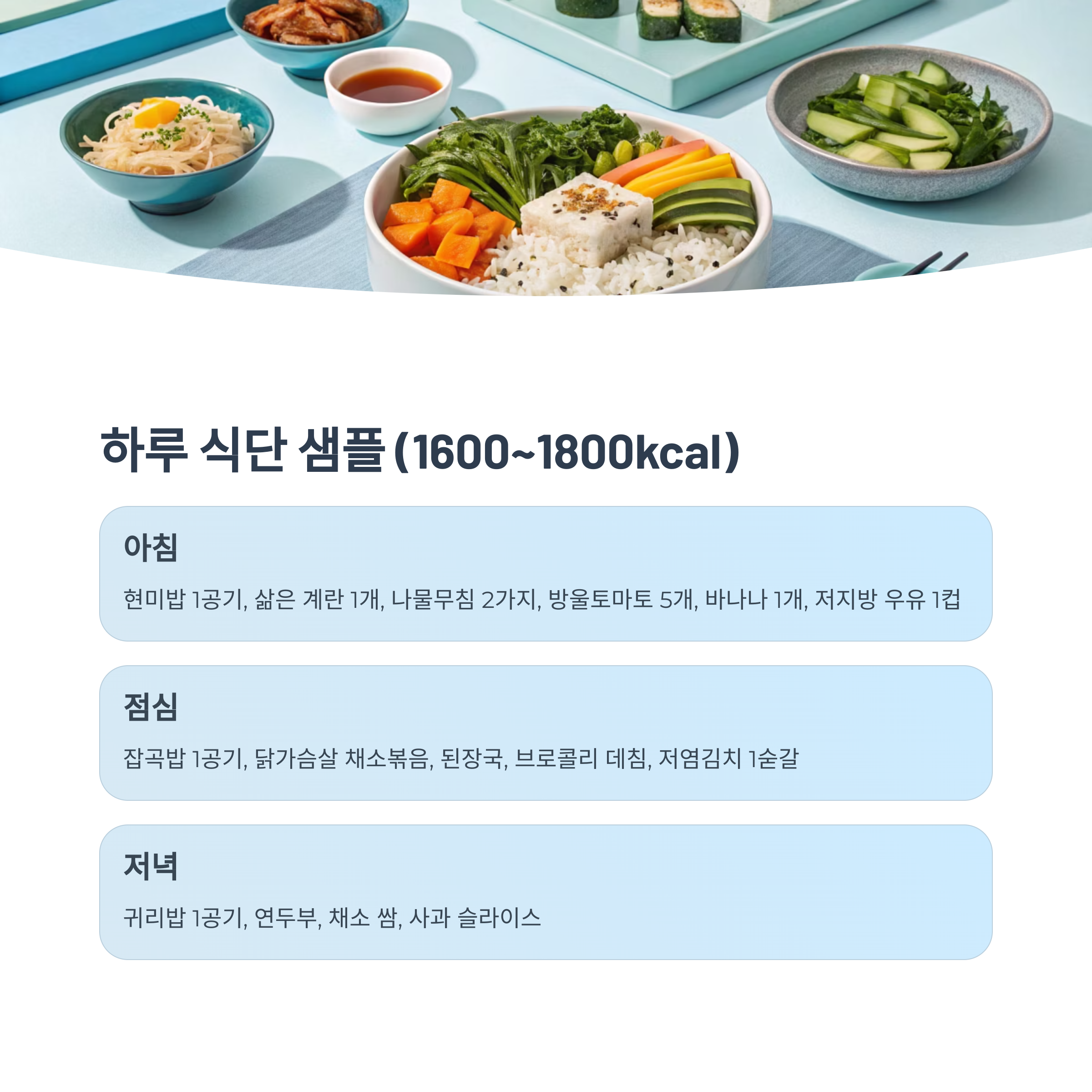 2. 고혈압 맞춤 하루 식단 샘플 (1600~1800kcal 기준)