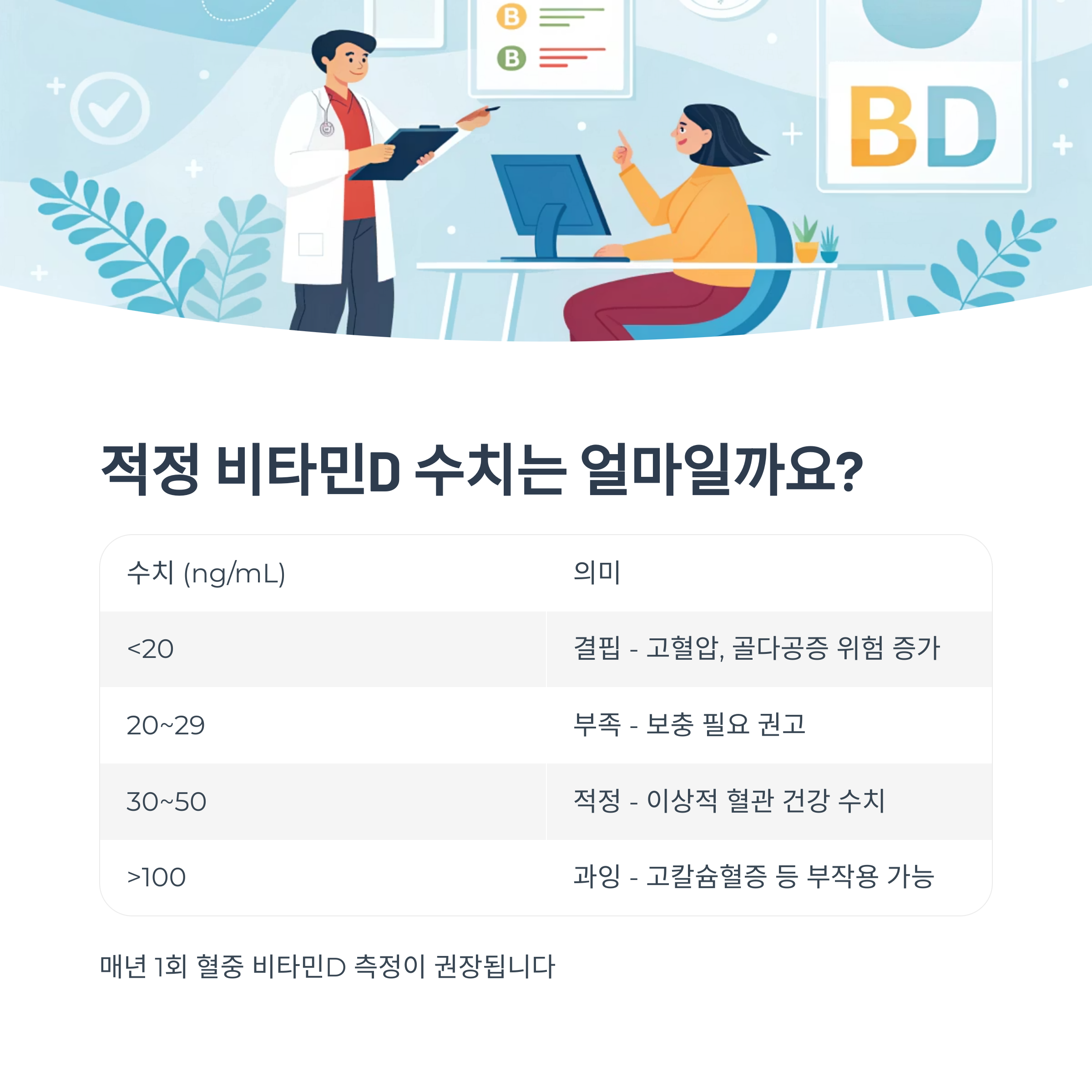 - 일반적으로 30~50ng/mL 유지가 이상적