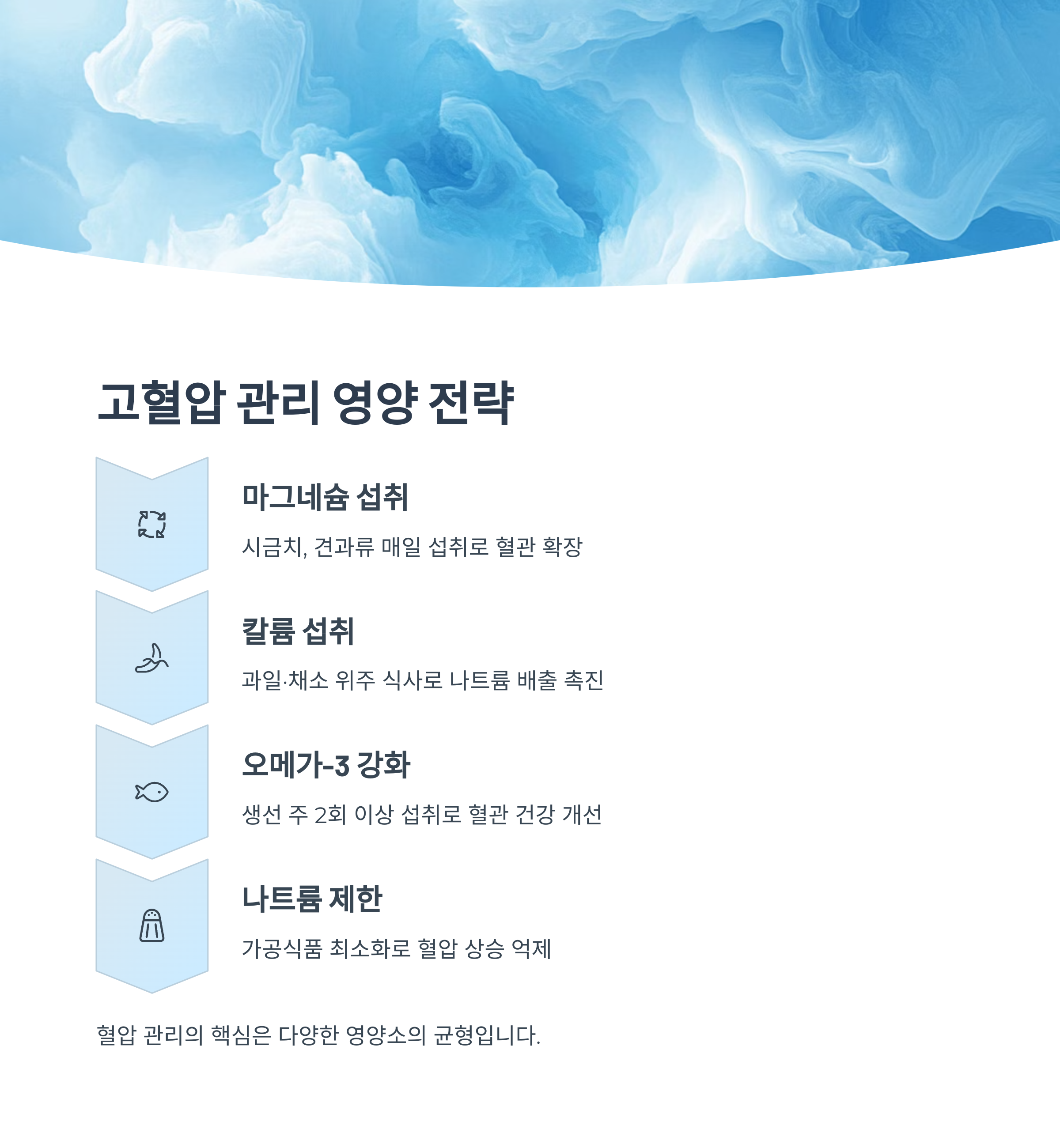 | 나트륨 제한 | 가공식품 최소화 | 혈압 상승 억제 |
