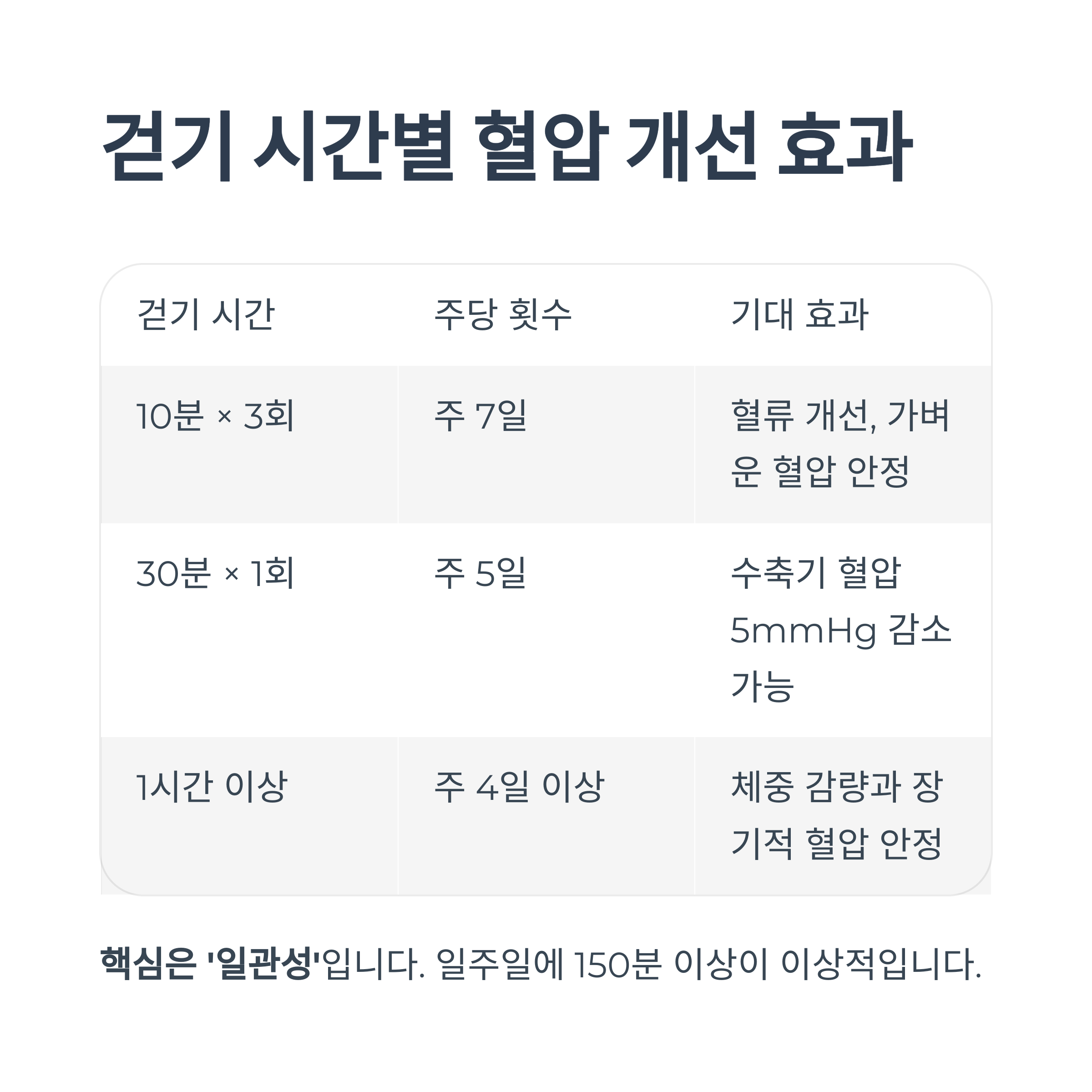 | 1시간 이상 | 주 4일 이상 | 체중 감량과 장기적 혈압 안정 |