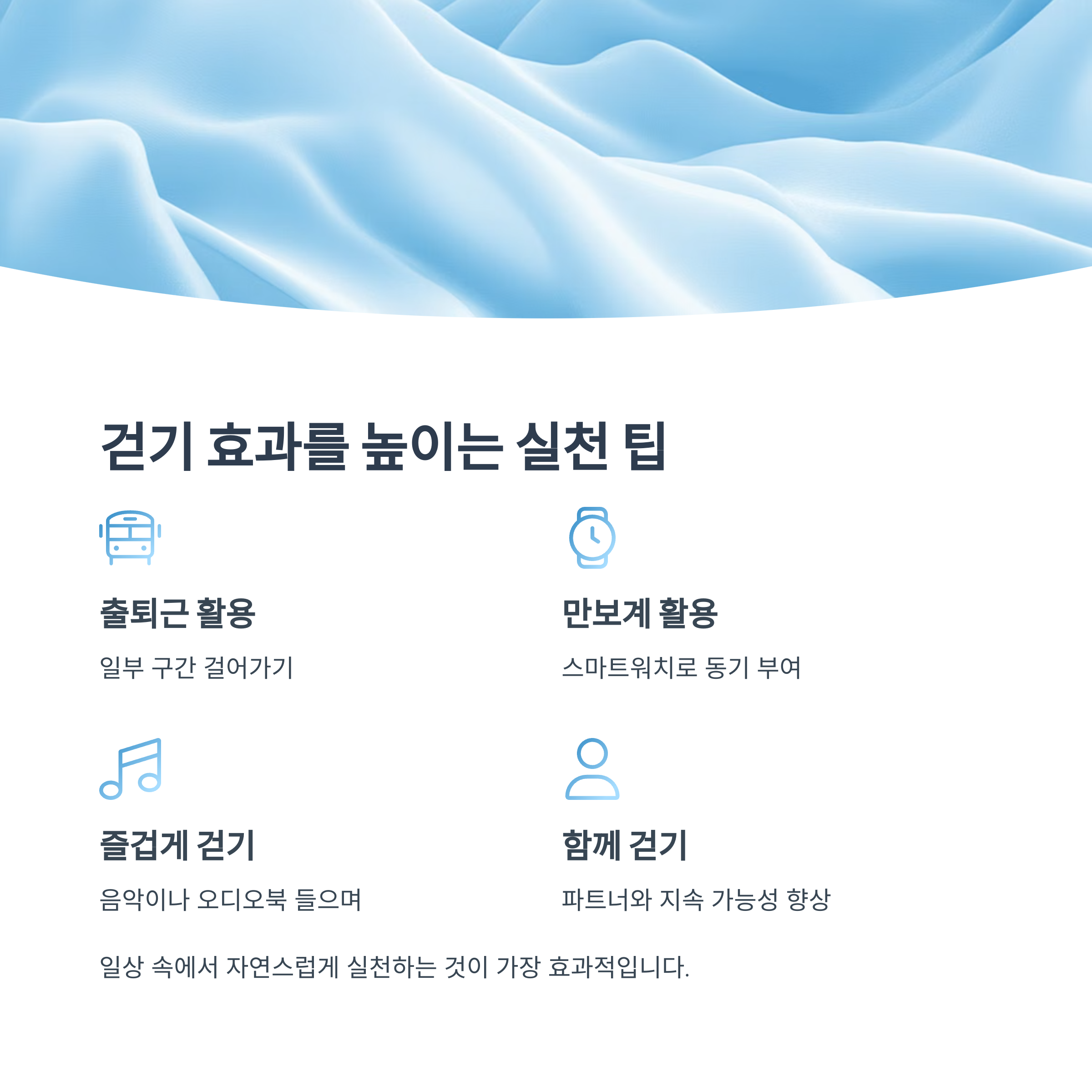 | 음악이나 오디오북 들으며 걷기 | 지루함 해소 |
