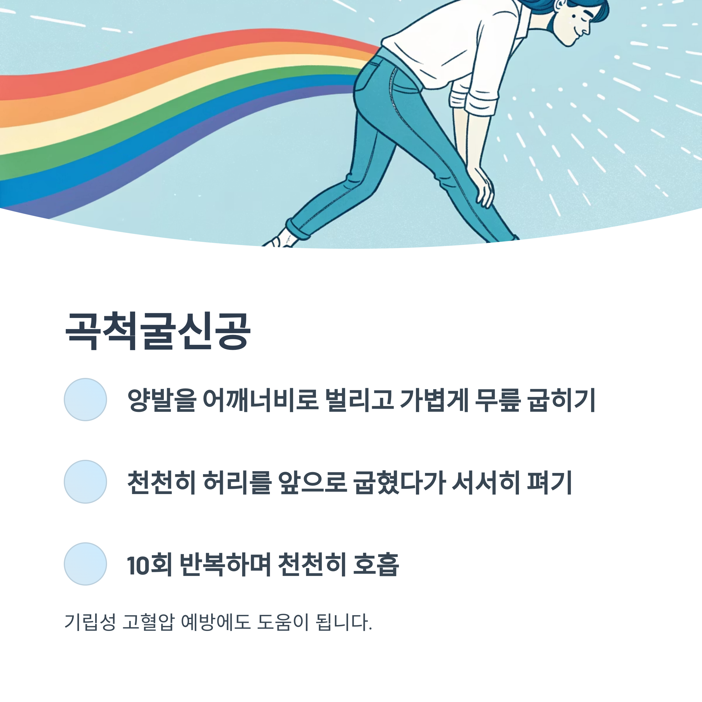 - 천천히 허리를 앞으로 굽혔다가 서서히 펴기 (호흡 연동)