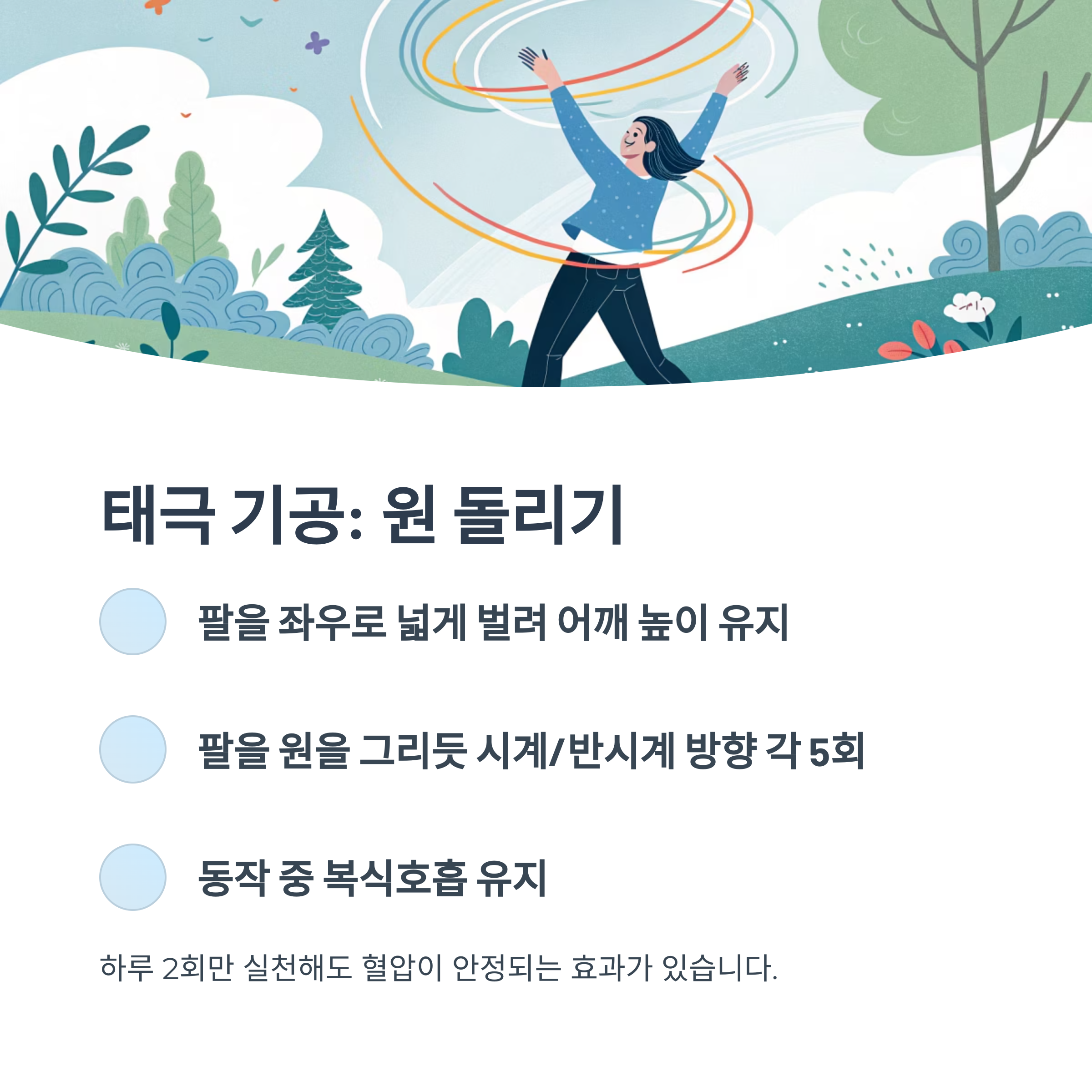 - 팔을 원을 그리듯 시계 방향 5회, 반시계 방향 5회
