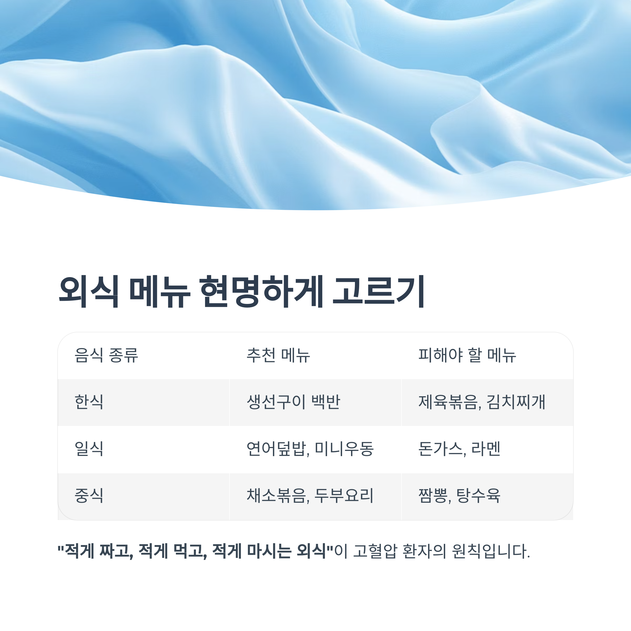 "적게 짜고, 적게 먹고, 적게 마시는 외식"이 고혈압 환자의 원칙입니다.