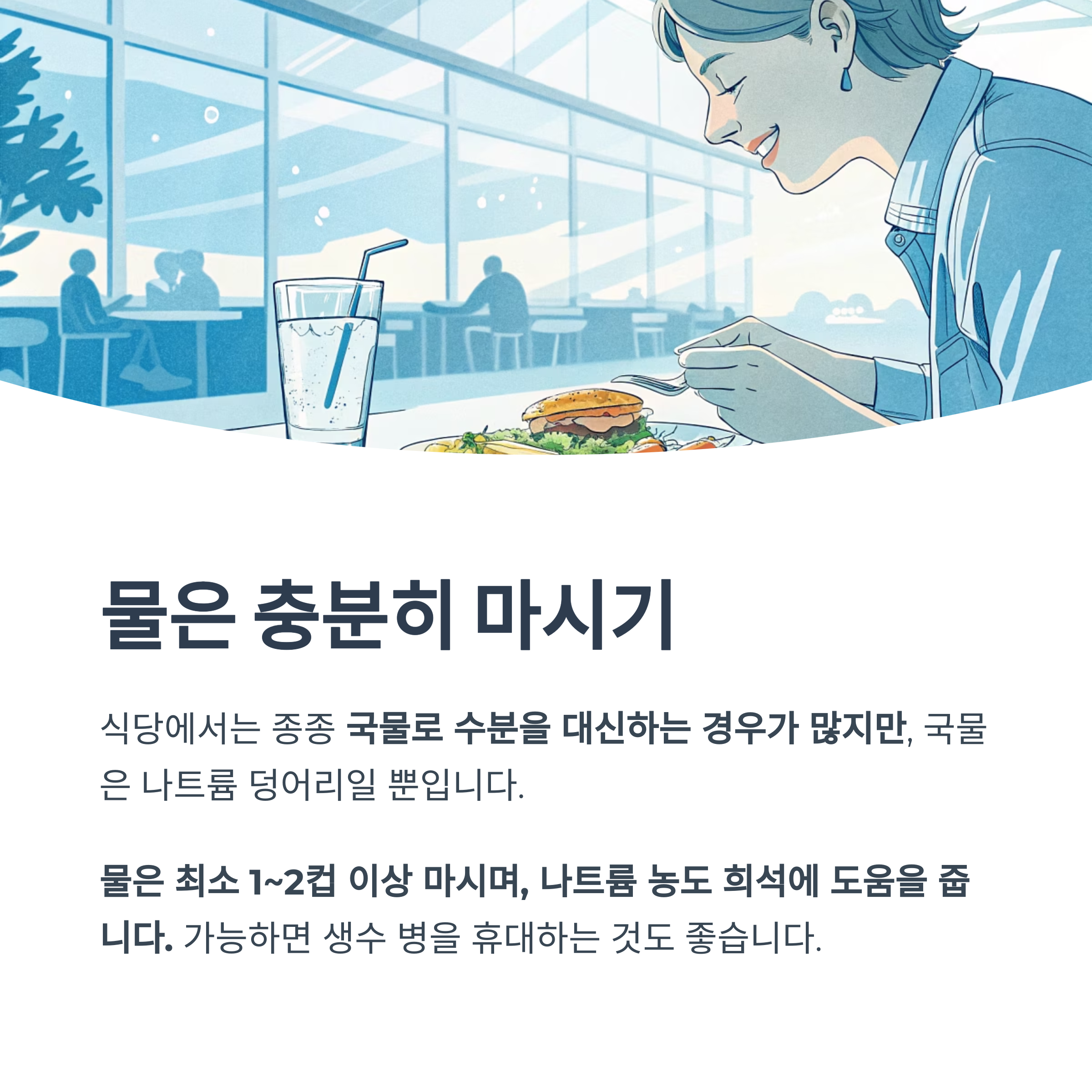 물은 최소 1~2컵 이상 마시며, 나트륨 농도 희석에 도움을 줍니다.