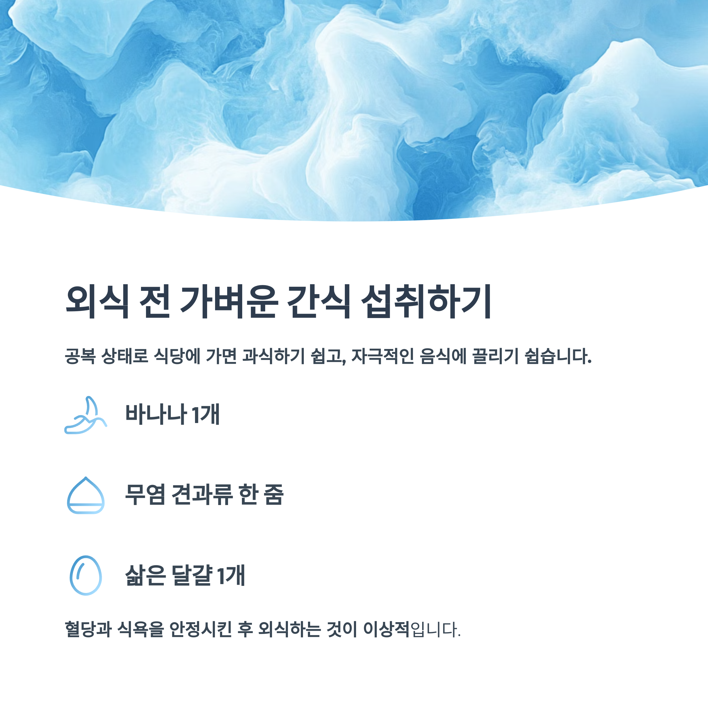 같은 간단한 간식으로 혈당과 식욕을 안정시킨 후 외식하는 것이 이상적입니다.