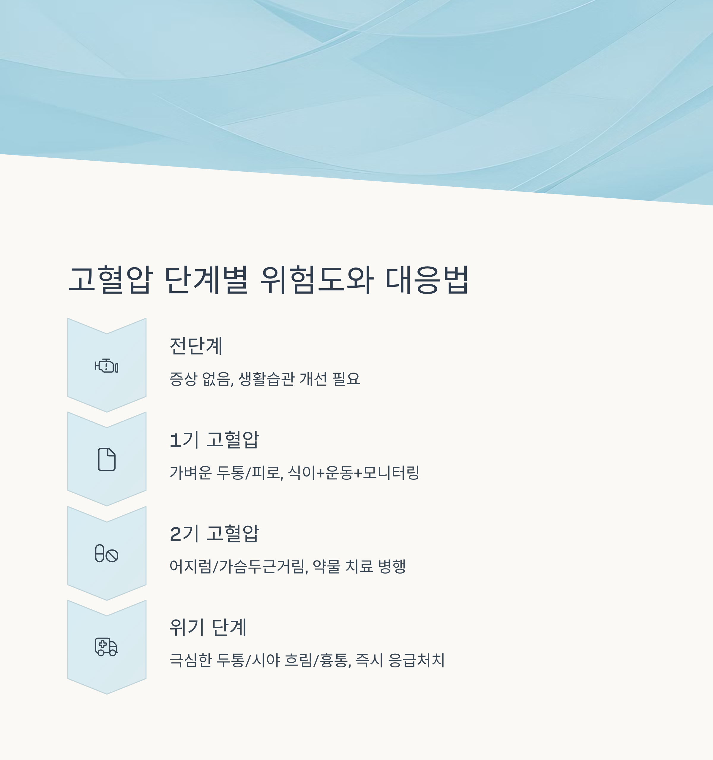| 위기 단계 | 극심한 두통, 시야 흐림, 흉통 | 매우 높음 | 즉시 응급처치 필요 |