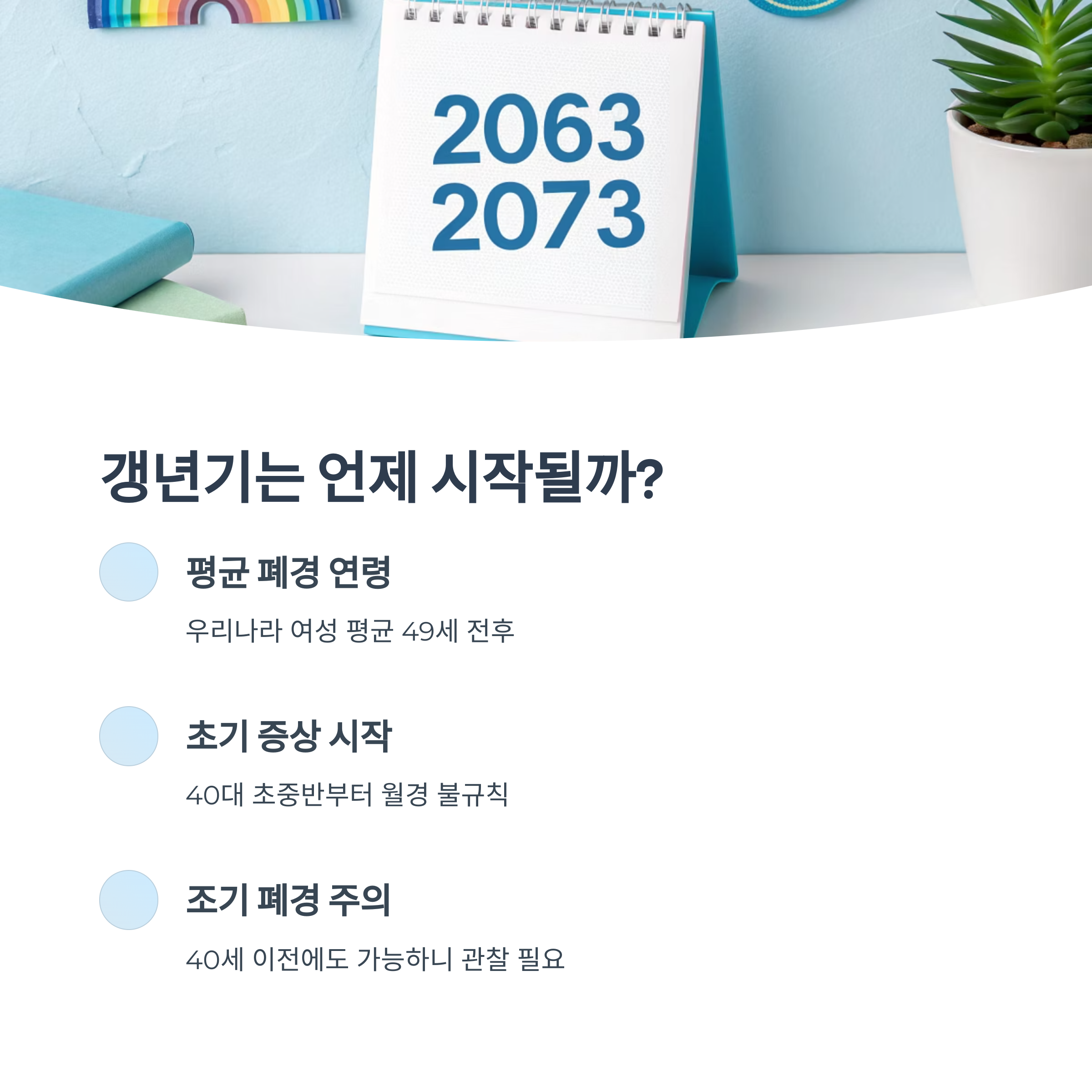 조기 폐경(40세 이전)도 있으므로, 나이만으로 단정하지 말고 신체 변화를 주의 깊게 살펴야 합니다.