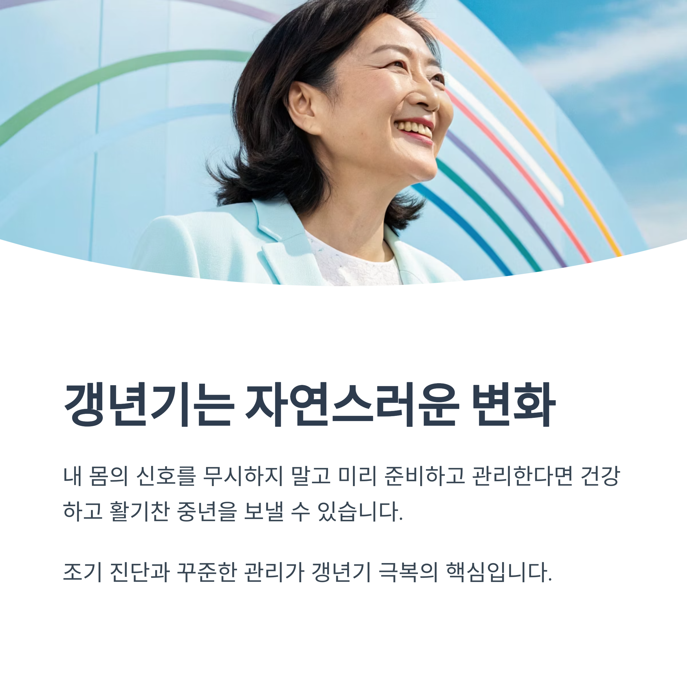 “갱년기 증상은 자연스러운 변화입니다. 내 몸의 신호를 무시하지 말고, 미리 준비하고 관리한다면 건강하고 활기찬 중년을 보낼 수 있습니다.”