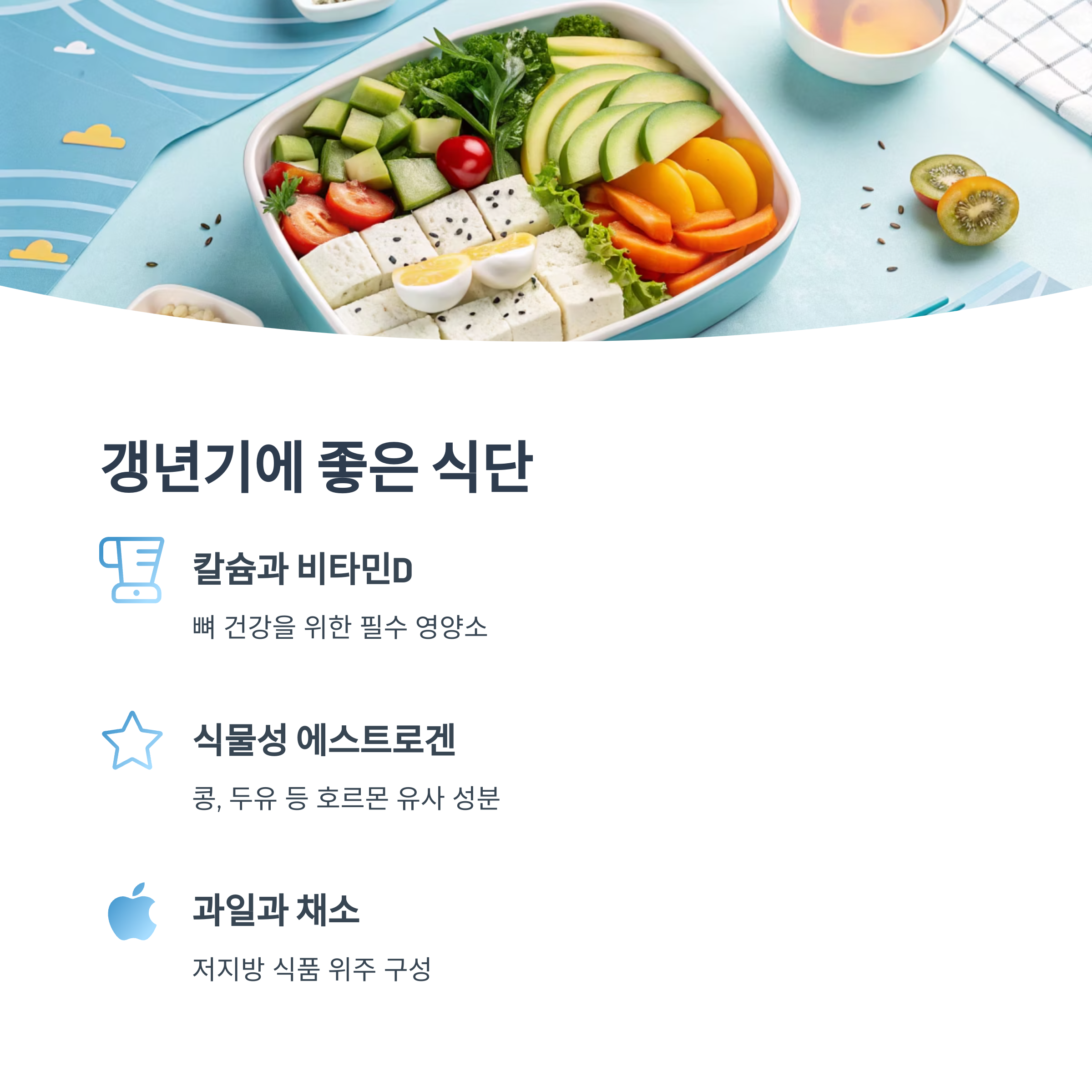 칼슘, 비타민D, 단백질, 식물성 에스트로겐(콩, 두유 등) 섭취를 늘리세요