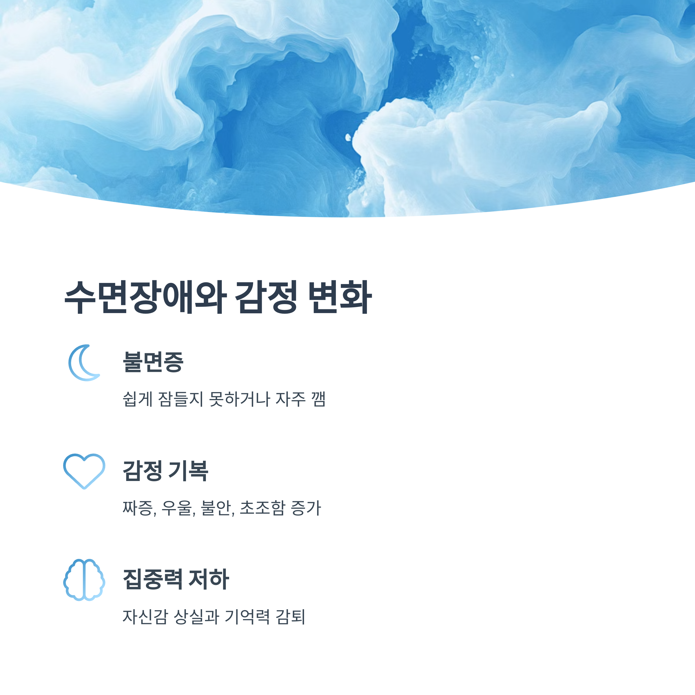 짜증, 우울, 불안, 초조, 감정 기복이 심해집니다. 집중력 저하, 자신감 상실도 나타날 수 있습니다