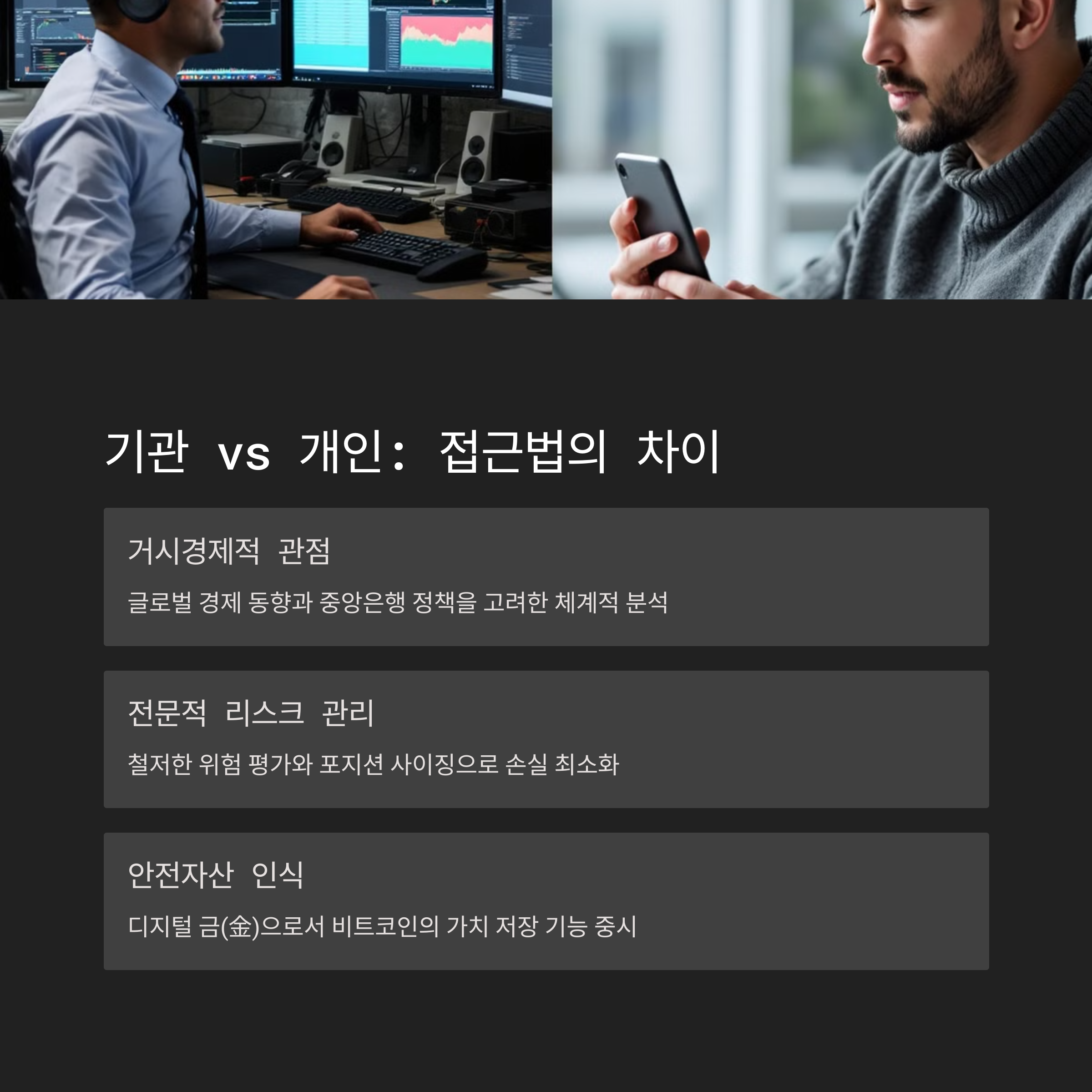 기관들은 가격 변동성 완화, 인플레이션 헤지, 장기 보유 전략을 기반으로 비트코인을 신흥 안전자산으로 다루고 있습니다. 이들은 단기 시세보다 거시적 자산 배분 전략의 일환으로 접근하며, 이는 개인 투자자와의 차별점이자 시장에 미치는 영향이 큽니다.