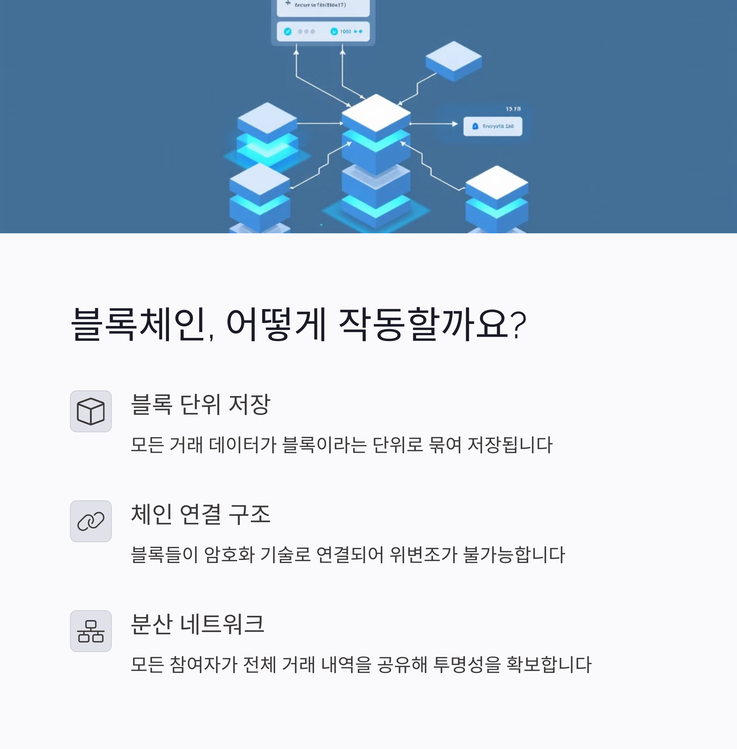 | 블록체인 정의 | 데이터를 블록 단위로 연결한 분산형 장부 시스템 |