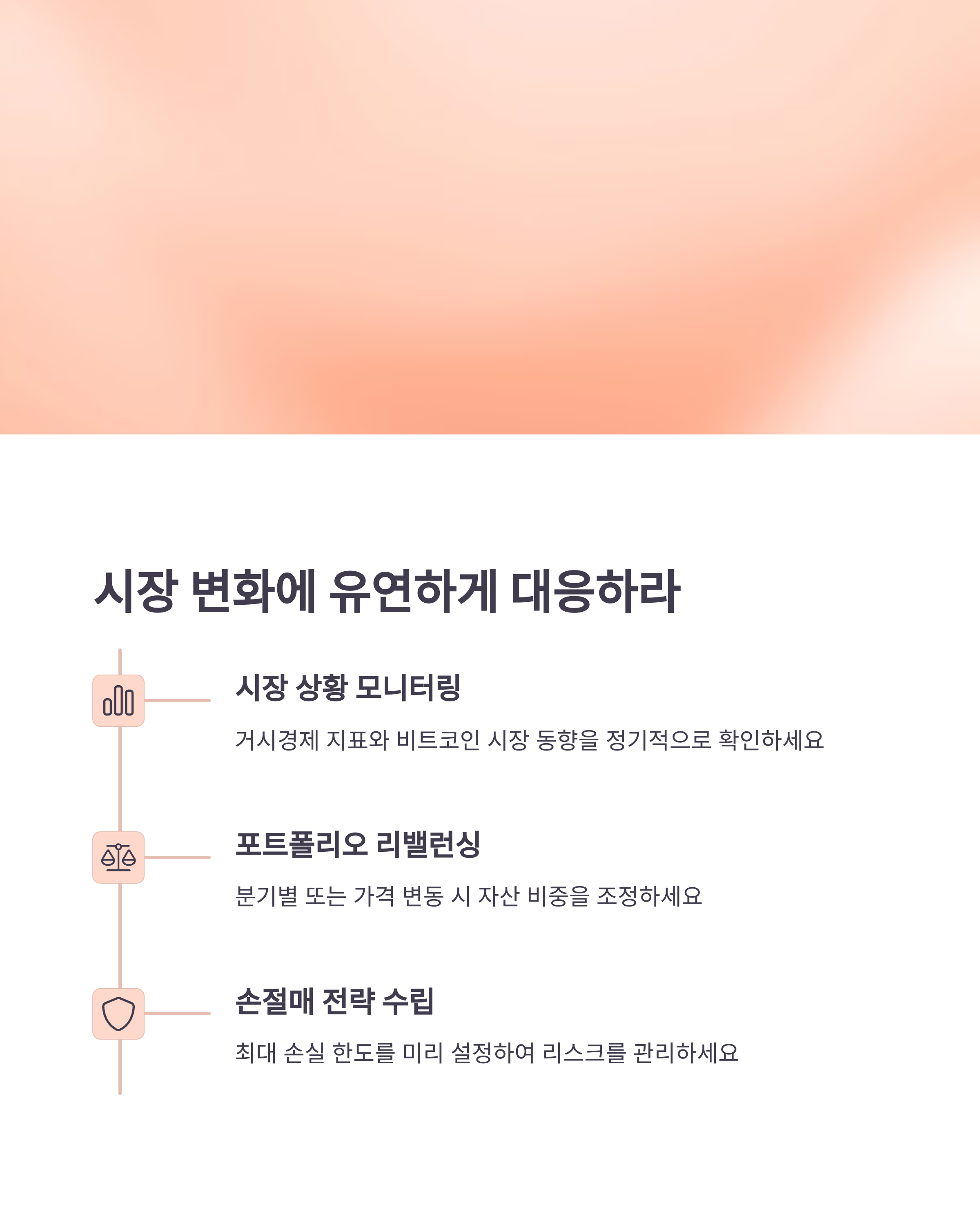 투자자들은 2025년을 기점으로 비트코인의 흐름을 예측하고 전략적으로 접근해야 합니다. 매수와 보유를 병행한 중장기 전략, 스테이블코인과의 균형 투자, 글로벌 경제 뉴스에 대한 민감한 대응력까지, 다양한 관점에서의 접근이 요구됩니다. 특히 수익률보다 지속 가능한 투자 방식이 강조되며, 포트폴리오 내 리스크 분산이 성공적인 투자로 이어질 가능성을 높여줍니다.