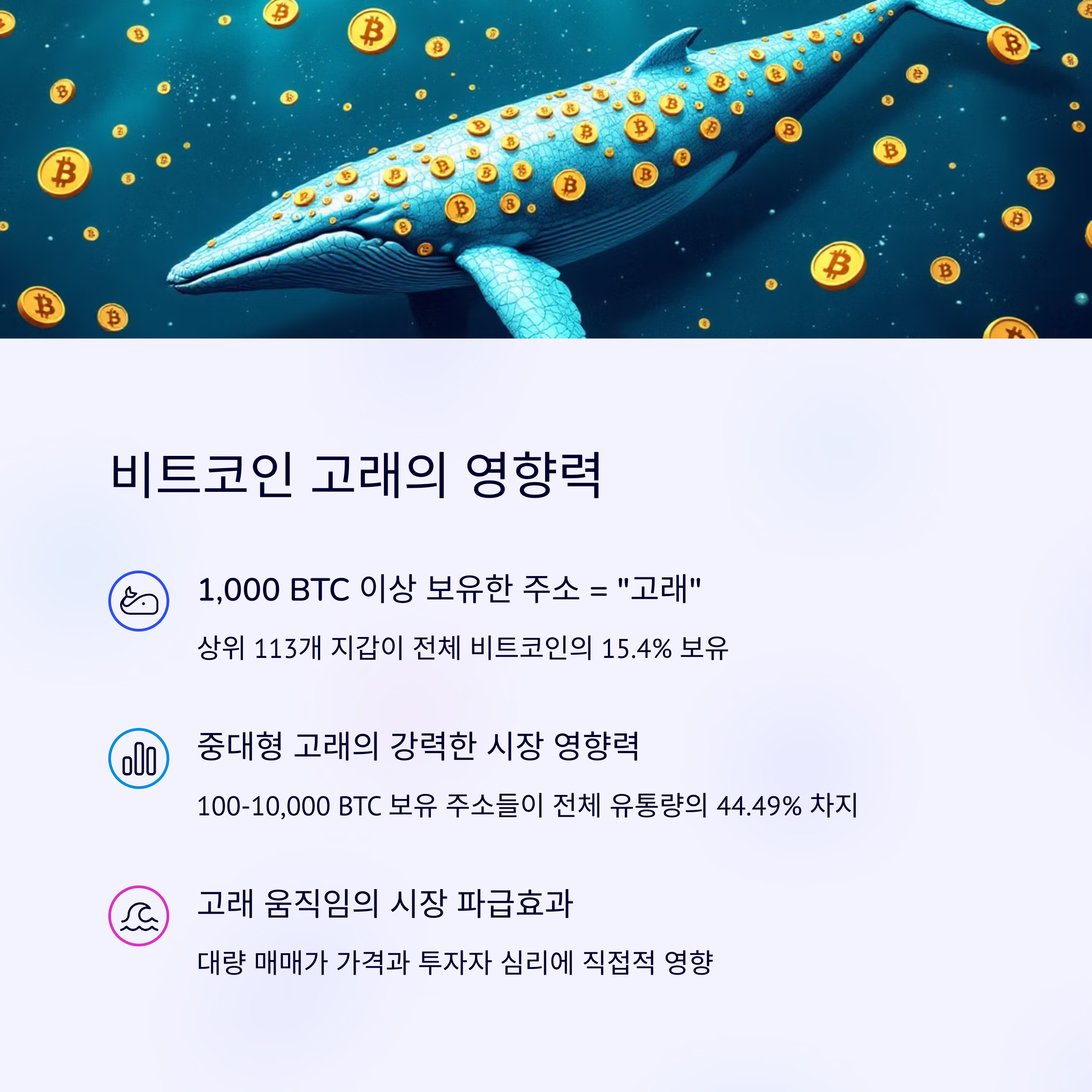 비트코인 시장은 여전히 규제가 느슨하고 거래소마다 유동성이 다르기 때문에 소수의 큰손 투자자(고래)들이 가격을 움직일 수 있다는 우려가 많습니다. 특히 일부 고래의 대량 매도/매수는 일시적 급등락을 유발하며, 시장 전체가 휘청이는 원인이 되기도 합니다.