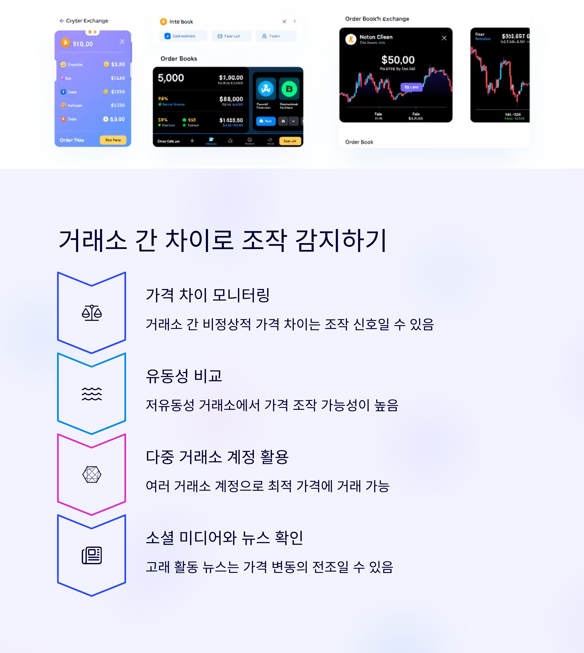 | 거래소 스푸핑 | 허위 주문으로 심리 조작 | 다중 거래소 비교 |