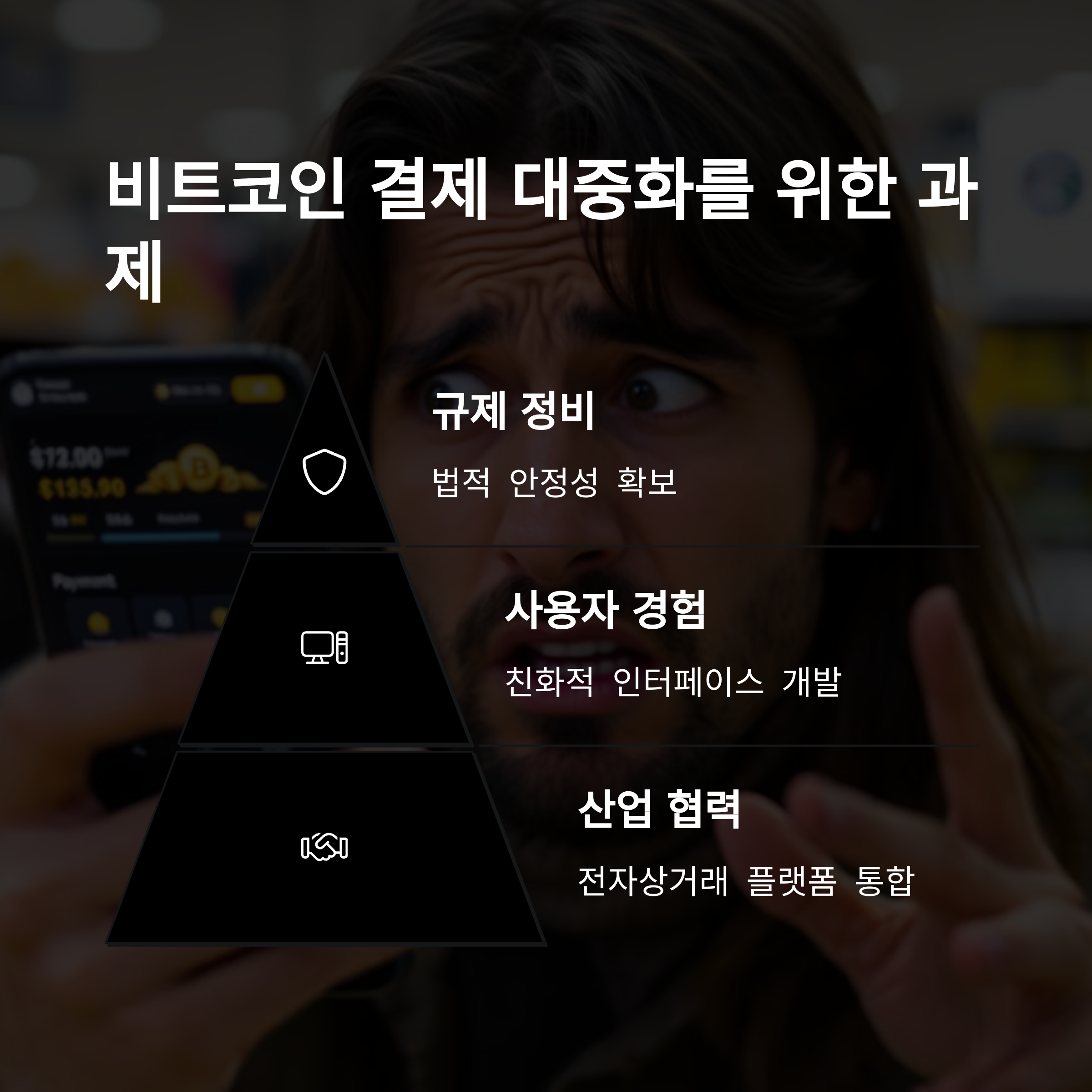 비트코인이 본격적인 결제 수단으로 자리 잡기 위해선 가격 안정화, 사용자 친화적 인터페이스, 글로벌 규제 정비가 필요합니다. 무엇보다 소액결제에 적합한 처리 속도와 낮은 수수료 확보가 중요합니다.