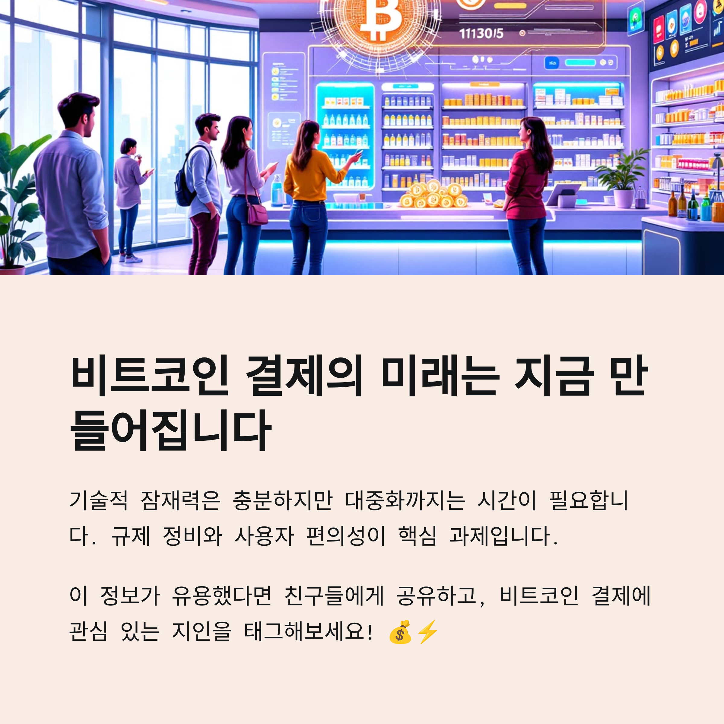 비트코인은 결제 수단으로서 분명한 잠재력을 갖고 있습니다. 그러나 보급화까지는 가격 안정성, 기술적 확장성, 제도적 정비가 필요합니다. 기술은 이미 준비되고 있으며, 제도와 인식이 따라오면 실생활 속 결제 수단으로 자리 잡을 가능성은 충분합니다.